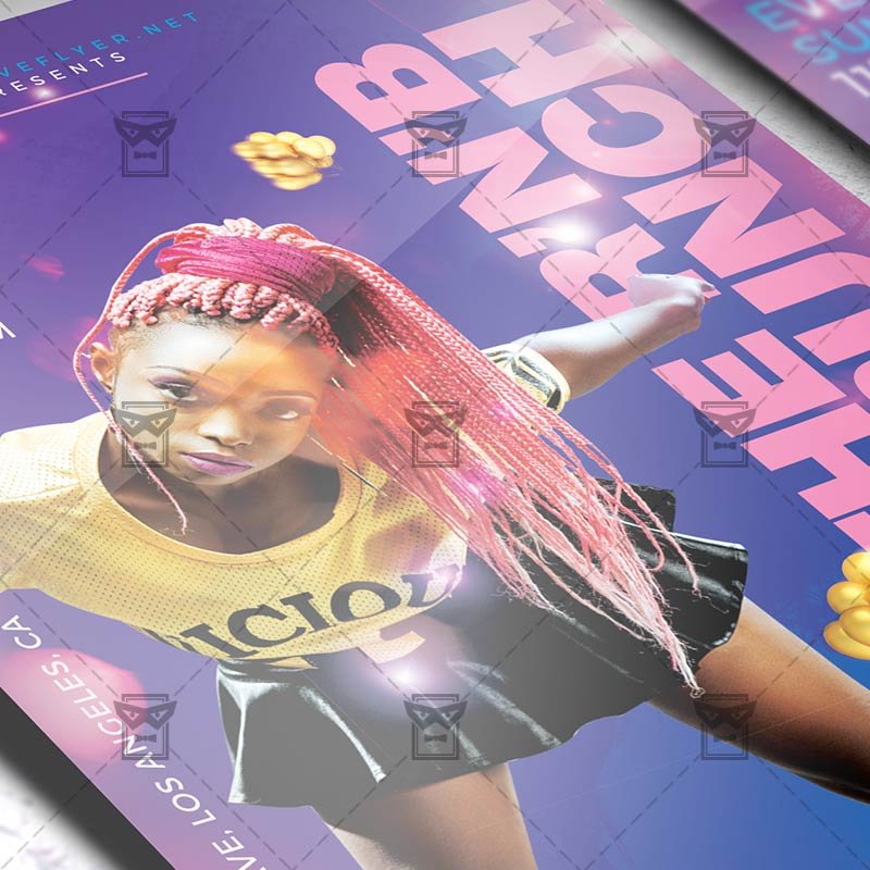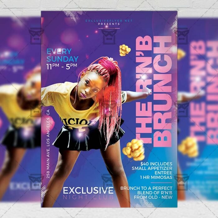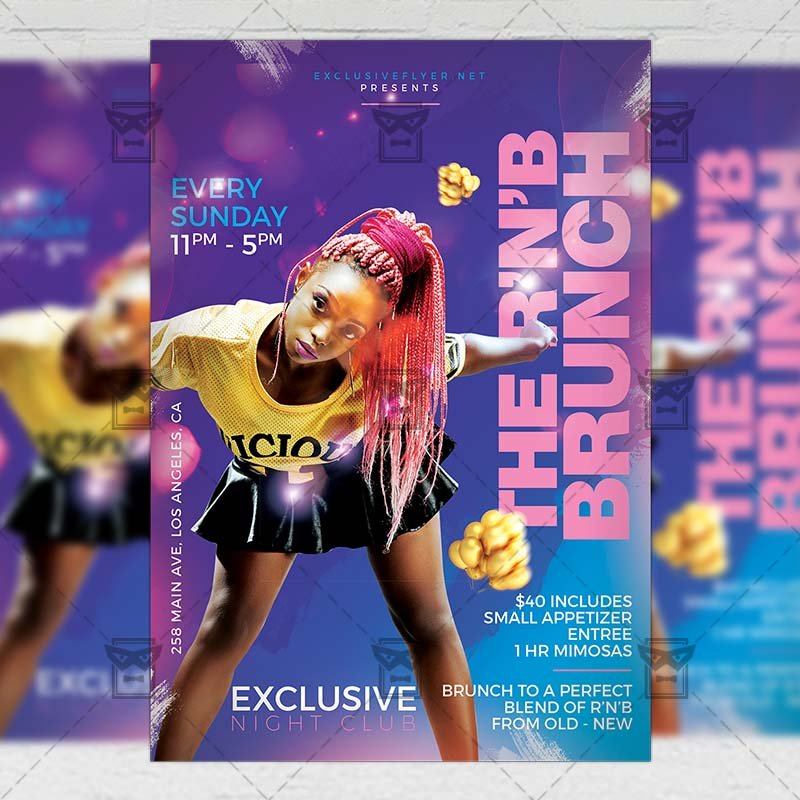 R’n’B Brunch an exclusive PSD flyer template for Adobe Photoshop designed by our best graphic designers to facilitate your task in promoting your business. With our readymade Club flyer in psd format you can invite you customers and guest to your event or to the best Friday Night, R’n’B Fridays, R & B Night, Hip Hop Party or Sound Vibes Night in their lives.