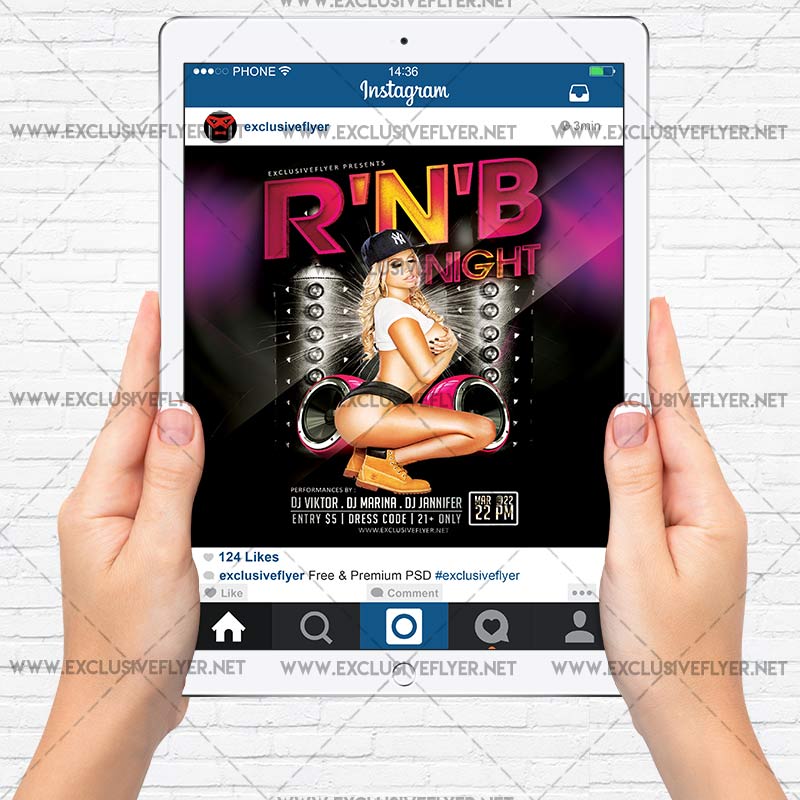 The R’n’B Night is the exclusive Photoshop PSD flyer template designed by ExclusiveFlyer to promote your R’n’B Night. This is a modern, stylish flyer and just be used for a Hip Hop Party, Rap Night, Music Night Party etc. Dear customers! – you can also: Customize any flyers or Hire Us to create any unique product. Also, you can get unlimited access to all our templates. You can buy 1 month membership, 3 or 6 months membership or even 1 year membership plan and login on site, choose a design, click the button DOWNLOAD TEMPLATE and it’s yours. No hassle, no checkout! When you paid the template, you can find it in your personal account and of course you’ve got a message to your e-mail (maybe in spam) with link to download. Also, you can find all templates, which you buy, in your personal account! All of our flyers have a very good quality (300DPI). And it means that you just need to download one of them and make the necessary modifications such as replace the elements or choose the colors and start to invite your guests! You can order from us design of Banner Ad, Bi-Fold Brochure, Tri-Fold Brochure, Business Card, Logo, One-Sided Flyer, Two-sided Flyer or Postcard. All you need is to checkout and write us all information on our e-mail or skype. (order now). There are a lot of free flyer templates, free business card templates on our site! Also there are a lot of categories of flyers such as club flyers, seasonal flyers, sport flyers and also business flyers. You have a great choise on our site, so good luck! Don’t forget to follow our Facebook community, our page on Twitter, on Pinterest and on Tumblr and leave comments, cause we work for you! PSD is set up in 1275×1875 dimension (4” x 6” with 0,25” bleed). The PSD file is very well organised, with color coded groups and layers named appropriately. Remember, all stock images of models and other people used only for demonstration all charms of the flyer and don’t included in the download!