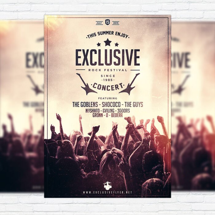 The Rock Concert is the exclusive Photoshop PSD flyer template designed by ExclusiveFlyer to promote your Rock Concert Party. This is a modern, stylish, fresh flyer and just be used for a Rock Party or Indie Night, or Show Party. Dear customers! – you can also: Customize any flyers or Hire Us to create any unique product. Also, you can get unlimited access to all our templates. You can buy 1 month membership, 3 or 6 months membership or even 1 year membership plan and login on site, choose a design, click the button DOWNLOAD TEMPLATE and it’s yours. No hassle, no checkout! When you paid the template, you can find it in your personal account and of course you’ve got a message to your e-mail (maybe in spam) with link to download. Also, you can find all templates, which you buy, in your personal account! All of our flyers have a very good quality (300DPI). And it means that you just need to download one of them and make the necessary modifications such as replace the elements or choose the colors and start to invite your guests! You can order from us design of Banner Ad, Bi-Fold Brochure, Tri-Fold Brochure, Business Card, Logo, One-Sided Flyer, Two-sided Flyer or Postcard. All you need is to checkout and write us all information on our e-mail or skype. (order now). There are a lot of free flyer templates, free business card templates on our site! Also there are a lot of categories of flyers such as club flyers, seasonal flyers, sport flyers and also business flyers. You have a great choise on our site, so good luck! Don’t forget to follow our Facebook community, our page on Twitter, on Pinterest and on Tumblr and leave comments, cause we work for you! PSD is set up in 1275×1875 dimension (4″×6″ with 0,25″ bleed). The PSD file is very well organised, with color coded groups and layers named appropriately. Remember, all stock images of models and other people used only for demonstration all charms of the flyer and don’t included in the download!