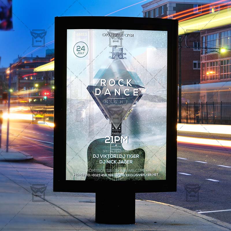 Rock Dance Night is an exclusive PSD flyer template for Adobe Photoshop designed by our best graphic designers to facilitate your task in promoting your business. With our readymade Indie/Rock flyer in psd format you can invite you customers and guest to your event or to the best Indie Party, Rock Night or Rock Festival in their lives.
