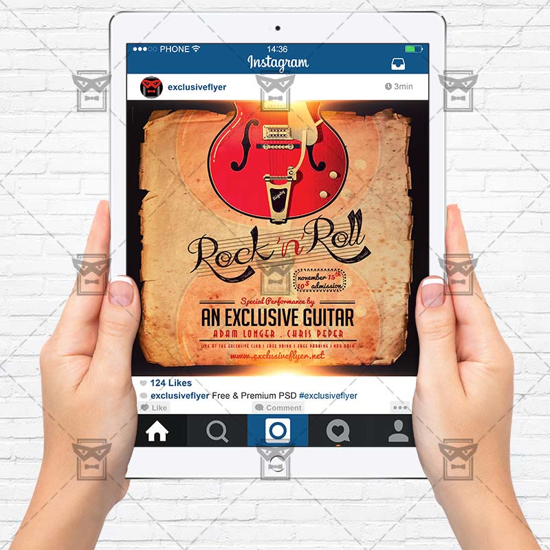 The Rock’n’Roll is the exclusive Photoshop PSD flyer template designed by ExclusiveFlyer to promote your Rock’n’Roll Night. This is a modern, stylish flyer and just be used for a Rock’n’Roll Night, Indie Tournament etc. Dear customers! – you can also: Customize any flyers or Hire Us to create any unique product. Also, you can get unlimited access to all our templates. You can buy 1 month membership, 3 or 6 months membership or even 1 year membership plan and login on site, choose a design, click the button DOWNLOAD TEMPLATE and it’s yours. No hassle, no checkout! When you paid the template, you can find it in your personal account and of course you’ve got a message to your e-mail (maybe in spam) with link to download. Also, you can find all templates, which you buy, in your personal account! All of our flyers have a very good quality (300DPI). And it means that you just need to download one of them and make the necessary modifications such as replace the elements or choose the colors and start to invite your guests! You can order from us design of Banner Ad, Bi-Fold Brochure, Tri-Fold Brochure, Business Card, Logo, One-Sided Flyer, Two-sided Flyer or Postcard. All you need is to checkout and write us all information on our e-mail or skype. (order now). There are a lot of free flyer templates, free business card templates on our site! Also there are a lot of categories of flyers such as club flyers, seasonal flyers, sport flyers and also business flyers. You have a great choise on our site, so good luck! Don’t forget to follow our Facebook community, our page on Twitter, on Pinterest and on Tumblr and leave comments, cause we work for you! PSD is set up in 1275×1875 dimension (4” x 6” with 0,25” bleed). The PSD file is very well organised, with color coded groups and layers named appropriately. Remember, all stock images of models and other people used only for demonstration all charms of the flyer and don’t included in the download!
