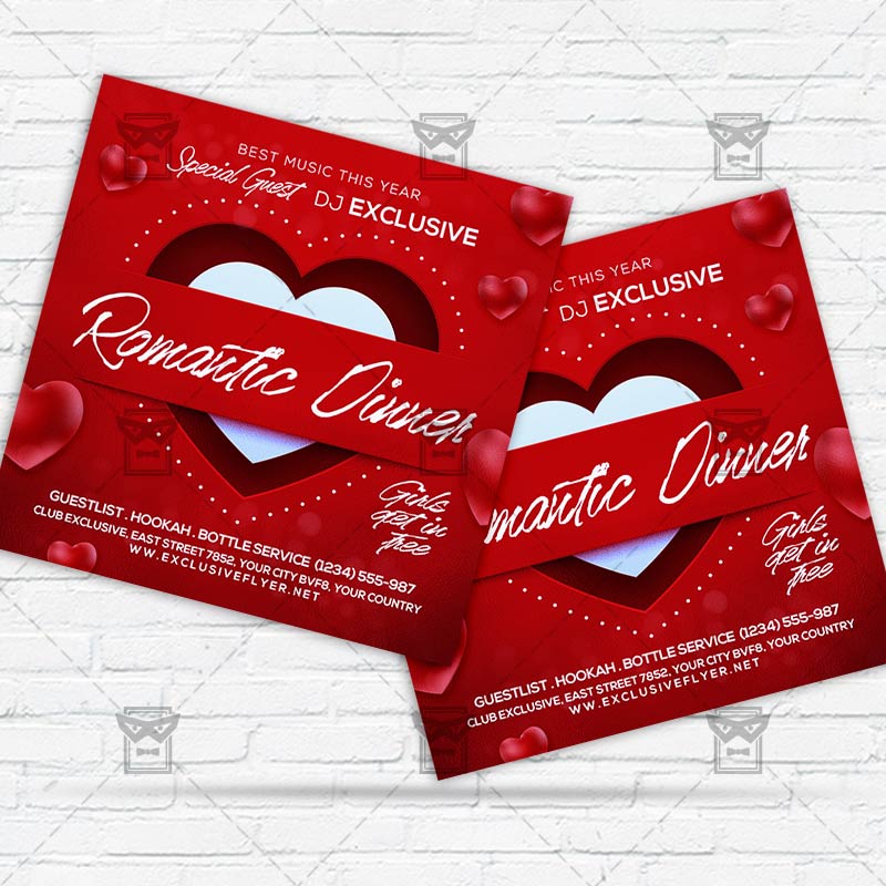 Romantic Dinner Template an exclusive PSD flyer template for Adobe Photoshop designed by our best graphic designers to facilitate your task in promoting your business. With our readymade Club flyer in psd format you can invite you customers and guest to your event or to the best Happy Valentines Day, Valentines Day, Valentines Party, Love Party, Celebration of Love, Romantic Night, Speed Dating Event in their lives.
