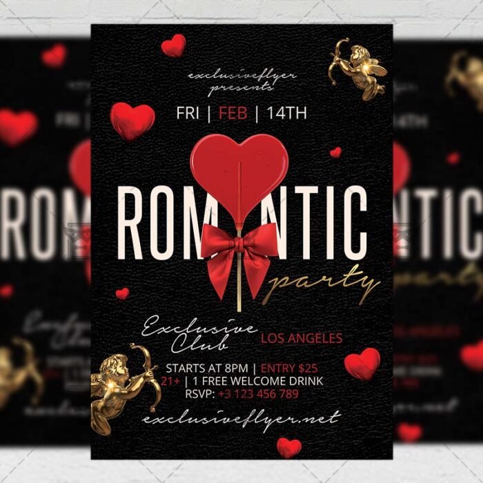 Romantic Party is an exclusive PSD flyer template for Adobe Photoshop designed by our best graphic designers to facilitate your task in promoting your business. With our readymade Valentines flyer in psd format you can invite you customers and guest to your event or to the best Love Party, Valentines Night, V-Day Party Night or St. Valentines Day Celebration Party in their lives.