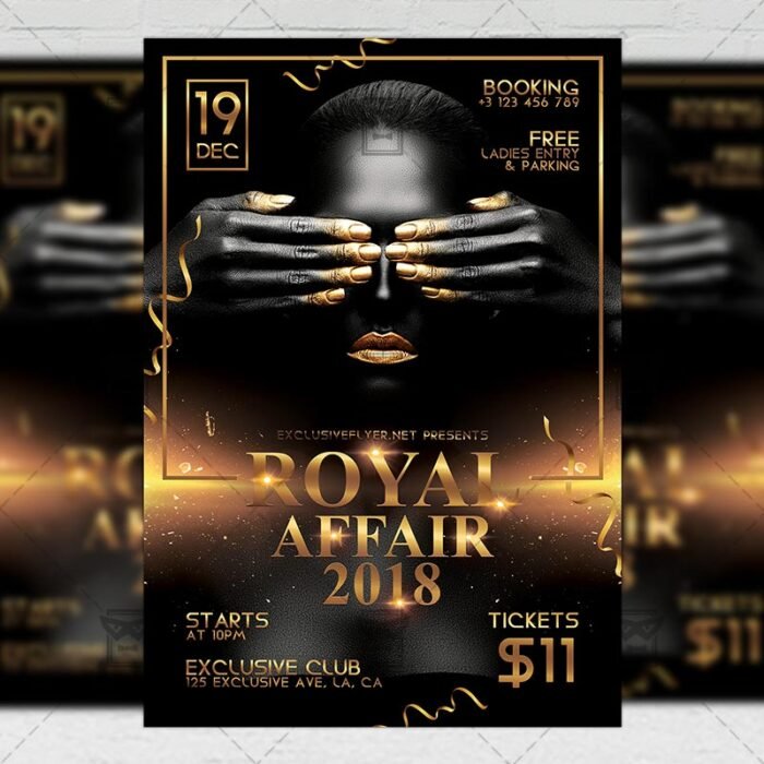 Royal Affair is an exclusive PSD flyer template for Adobe Photoshop designed by our best graphic designers to facilitate your task in promoting your business. With our readymade Luxury flyer in psd format you can invite you customers and guest to your event or to the best Luxury Night, VIP Party, Royal Night Party or King Night in their lives.