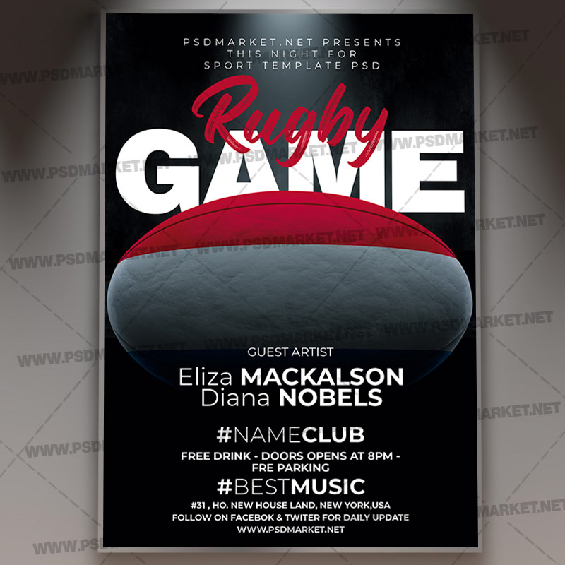 Rugby Game PSD Template Flyer is a simply modern flyer design by PSDmarket Team to be used with Photoshop CS3 and higher. Save your time and use it for business or for your clients! This can be use for Rugby, Rugby Game, Rugby Tournament, Rugby Day, Rugby Night, Extreme Sport, Rugby Championships and others.