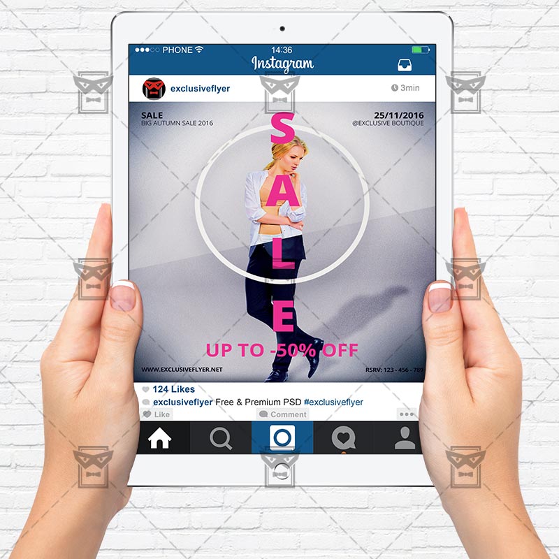The Sale is the exclusive Photoshop PSD flyer template designed by ExclusiveFlyer to promote your Sale. This is a modern, stylish flyer and just be used for a Autumn Sale, Summer Sale, Winter Sale, Black Friday, Super Sale etc. Dear customers! – you can also: Customize any flyers or Hire Us to create any unique product. Also, you can get unlimited access to all our templates. You can buy 1 month membership, 3 or 6 months membership or even 1 year membership plan and login on site, choose a design, click the button DOWNLOAD TEMPLATE and it’s yours. No hassle, no checkout! When you paid the template, you can find it in your personal account and of course you’ve got a message to your e-mail (maybe in spam) with link to download. Also, you can find all templates, which you buy, in your personal account! All of our flyers have a very good quality (300DPI). And it means that you just need to download one of them and make the necessary modifications such as replace the elements or choose the colors and start to invite your guests! You can order from us design of Banner Ad, Bi-Fold Brochure, Tri-Fold Brochure, Business Card, Logo, One-Sided Flyer, Two-sided Flyer or Postcard. All you need is to checkout and write us all information on our e-mail or skype. (order now). There are a lot of free flyer templates, free business card templates on our site! Also there are a lot of categories of flyers such as club flyers, seasonal flyers, sport flyers and also business flyers. You have a great choise on our site, so good luck! Don’t forget to follow our Facebook community, our page on Twitter, on Pinterest and on Tumblr and leave comments, cause we work for you! PSD is set up in 1275×1875 dimension (4” x 6” with 0,25” bleed). The PSD file is very well organised, with color coded groups and layers named appropriately. Remember, all stock images of models and other people used only for demonstration all charms of the flyer and don’t included in the download!