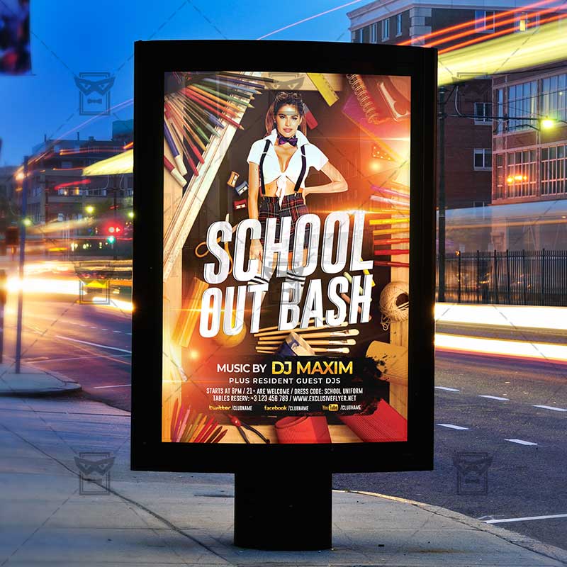 School Out Bash an exclusive PSD flyer template for Adobe Photoshop designed by our best graphic designers to facilitate your task in promoting your business. With our readymade School flyer in psd format you can invite you customers and guest to your event or to the best Back to School Party, School Out Night, Back 2 School Night or School Party in their lives.