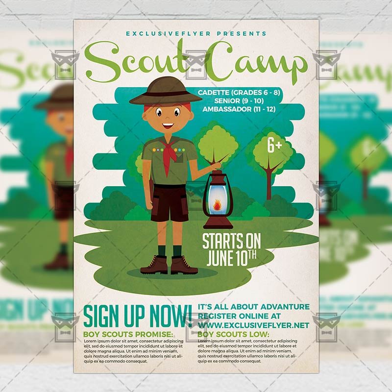 Scout Camp an exclusive PSD flyer template for Adobe Photoshop designed by our best graphic designers to facilitate your task in promoting your business. With our readymade Kids flyer in psd format you can invite you customers and guest to your event or to the best Scouts Summer Camp, Boy Scouts Camp, Girl Scouts Camp, Kids Summer Camp or Youth Camp in their lives.