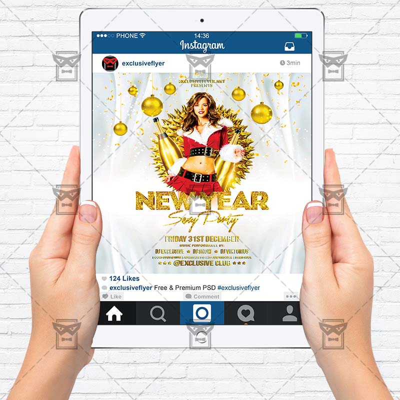 The Sexy New Year Party is the exclusive Photoshop PSD flyer template designed by ExclusiveFlyer to promote your Sexy New Year Party. This is a modern, stylish flyer and just be used for a Christmas Night, New Year Party etc. Dear customers! – you can also: Customize any flyers or Hire Us to create any unique product. Also, you can get unlimited access to all our templates. You can buy 1 month membership, 3 or 6 months membership or even 1 year membership plan and login on site, choose a design, click the button DOWNLOAD TEMPLATE and it’s yours. No hassle, no checkout! When you paid the template, you can find it in your personal account and of course you’ve got a message to your e-mail (maybe in spam) with link to download. Also, you can find all templates, which you buy, in your personal account! All of our flyers have a very good quality (300DPI). And it means that you just need to download one of them and make the necessary modifications such as replace the elements or choose the colors and start to invite your guests! You can order from us design of Banner Ad, Bi-Fold Brochure, Tri-Fold Brochure, Business Card, Logo, One-Sided Flyer, Two-sided Flyer or Postcard. All you need is to checkout and write us all information on our e-mail or skype. (order now). There are a lot of free flyer templates, free business card templates on our site! Also there are a lot of categories of flyers such as club flyers, seasonal flyers, sport flyers and also business flyers. You have a great choise on our site, so good luck! Don’t forget to follow our Facebook community, our page on Twitter, on Pinterest and on Tumblr and leave comments, cause we work for you! PSD is set up in 1275×1875 dimension (4” x 6” with 0,25” bleed). The PSD file is very well organised, with color coded groups and layers named appropriately. Remember, all stock images of models and other people used only for demonstration all charms of the flyer and don’t included in the download!