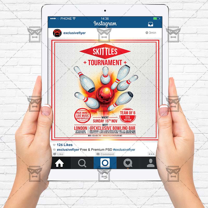 The Skittles Tournament is the exclusive Photoshop PSD flyer template designed by ExclusiveFlyer to promote your Skittles Tournament. This is a modern, stylish flyer and just be used for a Bowling Night, Bowling Tournament etc. Dear customers! – you can also: Customize any flyers or Hire Us to create any unique product. Also, you can get unlimited access to all our templates. You can buy 1 month membership, 3 or 6 months membership or even 1 year membership plan and login on site, choose a design, click the button DOWNLOAD TEMPLATE and it’s yours. No hassle, no checkout! When you paid the template, you can find it in your personal account and of course you’ve got a message to your e-mail (maybe in spam) with link to download. Also, you can find all templates, which you buy, in your personal account! All of our flyers have a very good quality (300DPI). And it means that you just need to download one of them and make the necessary modifications such as replace the elements or choose the colors and start to invite your guests! You can order from us design of Banner Ad, Bi-Fold Brochure, Tri-Fold Brochure, Business Card, Logo, One-Sided Flyer, Two-sided Flyer or Postcard. All you need is to checkout and write us all information on our e-mail or skype. (order now). There are a lot of free flyer templates, free business card templates on our site! Also there are a lot of categories of flyers such as club flyers, seasonal flyers, sport flyers and also business flyers. You have a great choise on our site, so good luck! Don’t forget to follow our Facebook community, our page on Twitter, on Pinterest and on Tumblr and leave comments, cause we work for you! PSD is set up in 1275×1875 dimension (4” x 6” with 0,25” bleed). The PSD file is very well organised, with color coded groups and layers named appropriately. Remember, all stock images of models and other people used only for demonstration all charms of the flyer and don’t included in the download!