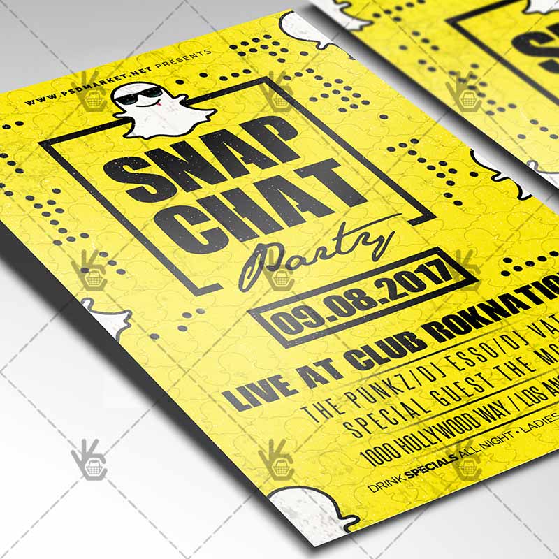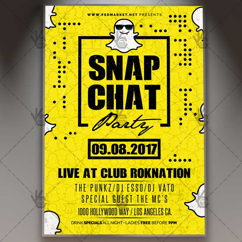 Snap Chat Party is a simply modern flyer design by PSDmarket Team to be used with Photoshop CS3 and higher. Save your time and use it for business or for your clients! This can be use for Snap Chat Night, Snap Party, Snap Chat Celebration, Social Chat Party, Snap Date Party, Snap Date Night and others.