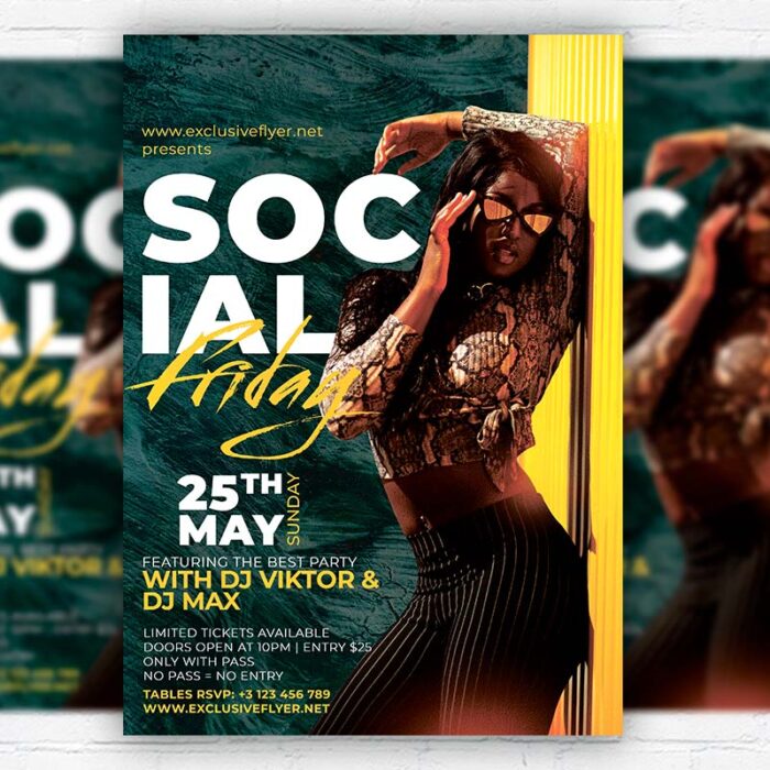 Social Fridays PSD Template Template an exclusive PSD flyer template for Adobe Photoshop designed by our best graphic designers to facilitate your task in promoting your business. This psd poster/flyer is the best choice for Social Fridays Party, Social Wednessday Night, Social Party, Dj Club Night, Dj Show or Dj Club Event. With our readymade Social Fridays PSD Template flyer in psd format you can invite you customers and guest to your event with a minimum of efforts and time.