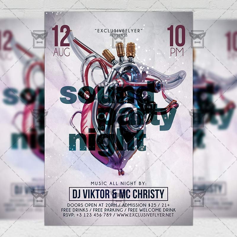 Sound Party Night an exclusive PSD flyer template for Adobe Photoshop designed by our best graphic designers to facilitate your task in promoting your business. With our readymade Club flyer in psd format you can invite you customers and guest to your event or to the best Club Party, Party Night, Happy Hours Party, Club Vibes, Sound Night or Dj Night in their lives.