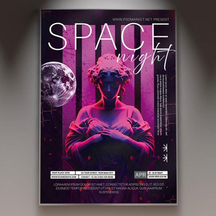 Space Night 2026 Flyer TemplatePrepare for a journey beyond the stars and experience an atmosphere that is truly out of this world! Our **Space Night 2026 Flyer Template** is a cosmic masterpiece designed for nightclubs, high-concept lounges, and futuristic event organizers looking to make a massive impact in the new year. As 2026 unfolds, immersive and celestial themes are at the forefront of the entertainment industry, and this professional PSD template captures that trend with cinematic precision. If you are planning an event that promises “**A Galactic Odyssey**,” “**Midnight on Mars**,” or “**The Ultimate Futuristic Party Experience**,” this template provides the perfect visual launchpad. Featuring stunning 3D planets, nebular gas clouds, high-tech HUD elements, and shimmering stardust, this design ensures your **Space Night** is the most anticipated event in the galaxy. The **Space Night 2026 Flyer Template** is engineered for versatility and professional ease of use. As a fully layered Photoshop file, it allows for deep customization, giving you the power to transform the cosmos to match your brand’s unique energy. You can effortlessly edit text layers to include your stellar DJ lineup, venue coordinates, date, and exclusive event highlights such as **neon body paint stations**, **zero-gravity cocktails**, **immersive laser light shows**, or **VIP “Astro-Lounge” access**. The organized folder structure and smart objects make it incredibly simple for designers and venue managers alike to adjust color grading, light flares, and background depth. This high-resolution template ensures that every star and galaxy remains crisp, whether you are promoting a high-energy techno night or a sophisticated celestial-themed gala. Optimized for the digital-first era of 2026, the **Space Night Flyer Template** is 100% print-ready at 300 DPI and perfectly formatted for viral social media sharing. You can produce breathtaking physical posters that glow on any wall while simultaneously dominating Instagram, Facebook, and TikTok with perfectly scaled graphics. This dual-purpose design ensures your message reaches a modern, tech-savvy audience, driving early ticket sales and building cosmic levels of hype. By choosing this distinctive and high-impact flyer, you are promising your guests a transformative experience. Make your “**Space Night 2026**” the highlight of the social season. Download this premium template today and take your event promotion to another dimension! — Features of the Space Night 2026 Flyer Template