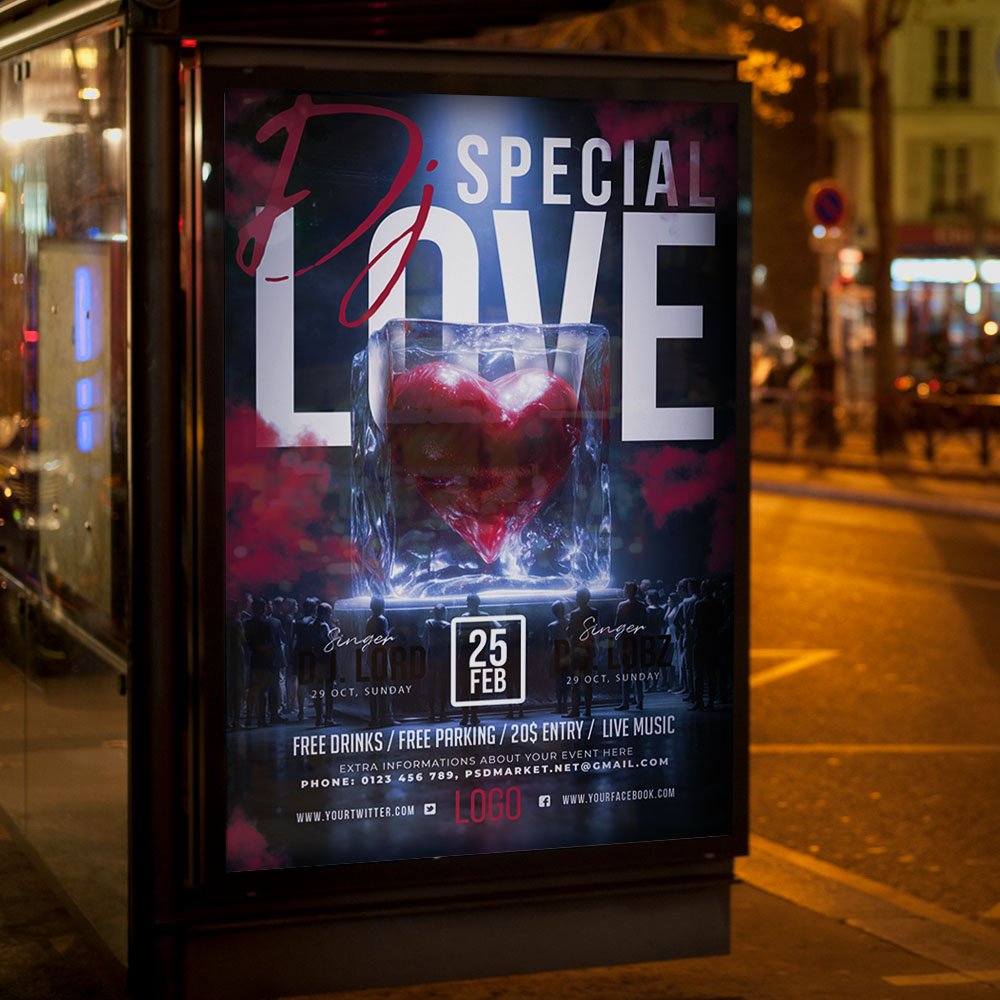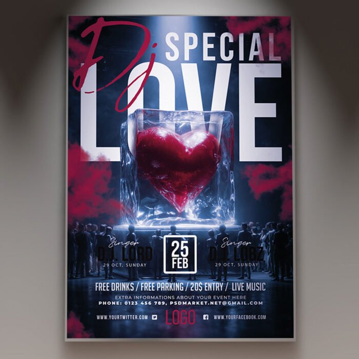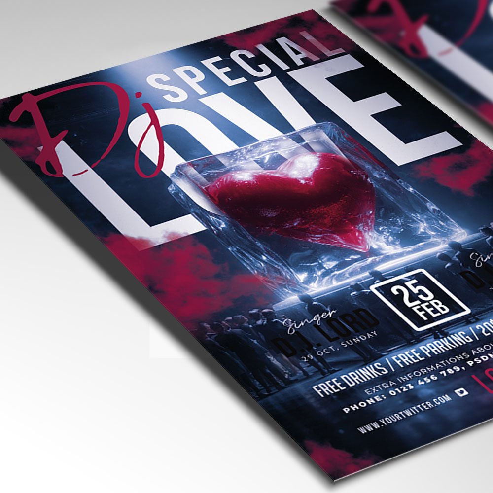 Special DJ Love Flyer PSD TemplateIgnite the passion on the dance floor and celebrate the rhythm of romance with our Special DJ Love Flyer PSD Template. Designed specifically for the 2026 event season, this professional Photoshop template is the perfect visual solution for Valentine’s Day parties, romantic deep house sets, “Love & Beats” themed nights, or exclusive wedding after-parties. In an era where emotional connection and immersive atmospheres are paramount, this flyer bridges the gap between high-energy clubbing and sophisticated elegance. Featuring stunning 3D heart elements, soft neon glows, and luxurious cinematic textures, it ensures your “Special DJ Love” event feels like a premium, must-attend occasion for couples and music lovers alike. The Special DJ Love Flyer PSD Template is built for absolute creative ease and professional impact. As a fully layered and meticulously organized Photoshop file, it grants you total control over every romantic detail. You can effortlessly edit text layers to feature your headlining DJ, the venue’s location, the date, and special event highlights such as “Love Potion” cocktail specials, romantic laser shows, VIP lounge access for couples, or live melodic performances. Using smart objects, you can swap background elements or adjust the intensity of the pink and purple lighting gradients to perfectly match your brand’s unique energy. This high-resolution template ensures your marketing looks polished, sophisticated, and elite. Optimized for a modern, multi-platform 2026 marketing strategy, this template is 100% print-ready and perfectly scaled for viral digital sharing. Whether you are printing high-gloss physical posters or exporting perfectly sized graphics for Instagram, TikTok, and Facebook, the Special DJ Love Flyer delivers crisp, vibrant results. By choosing this distinctive and heart-centered design, you are promising your guests more than just a party—you are inviting them to an emotional and sensory experience. Make your “Special DJ Love” night the highlight of the social calendar. Download this premium template today and start spreading the love with professional style! — Features of the Special DJ Love Flyer PSD Template