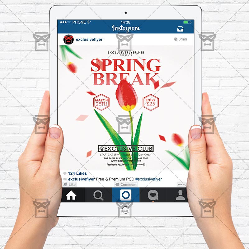 The Spring Break is the exclusive Photoshop PSD flyer template designed by ExclusiveFlyer to promote your Spring Break. This is a modern, stylish flyer and just be used for a Hello Spring Party, Spring Break Nightm Spring Opening Party, First Spring Party etc. Dear customers! – you can also: Customize any flyers or Hire Us to create any unique product. Also, you can get unlimited access to all our templates. You can buy 1 month membership, 3 or 6 months membership or even 1 year membership plan and login on site, choose a design, click the button DOWNLOAD TEMPLATE and it’s yours. No hassle, no checkout! When you paid the template, you can find it in your personal account and of course you’ve got a message to your e-mail (maybe in spam) with link to download. Also, you can find all templates, which you buy, in your personal account! All of our flyers have a very good quality (300DPI). And it means that you just need to download one of them and make the necessary modifications such as replace the elements or choose the colors and start to invite your guests! You can order from us design of Banner Ad, Bi-Fold Brochure, Tri-Fold Brochure, Business Card, Logo, One-Sided Flyer, Two-sided Flyer or Postcard. All you need is to checkout and write us all information on our e-mail or skype. (order now). There are a lot of free flyer templates, free business card templates on our site! Also there are a lot of categories of flyers such as club flyers, seasonal flyers, sport flyers and also business flyers. You have a great choise on our site, so good luck! Don’t forget to follow our Facebook community, our page on Twitter, on Pinterest and on Tumblr and leave comments, cause we work for you! PSD is set up in 1275×1875 dimension (4” x 6” with 0,25” bleed). The PSD file is very well organised, with color coded groups and layers named appropriately. Remember, all stock images of models and other people used only for demonstration all charms of the flyer and don’t included in the download!