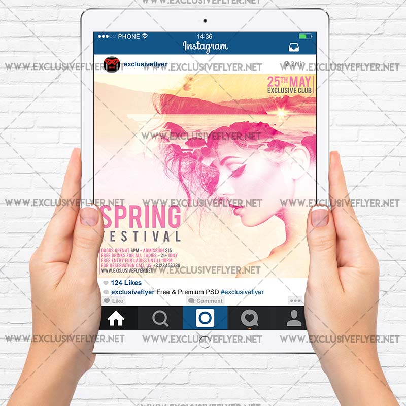 The Spring Festival is the exclusive Photoshop PSD flyer template designed by ExclusiveFlyer to promote your Spring Festival. This is a modern, stylish flyer and just be used for a Spring Festival Night, Spring Party or Summer Party etc. Dear customers! – you can also: Customize any flyers or Hire Us to create any unique product. Also, you can get unlimited access to all our templates. You can buy 1 month membership, 3 or 6 months membership or even 1 year membership plan and login on site, choose a design, click the button DOWNLOAD TEMPLATE and it’s yours. No hassle, no checkout! When you paid the template, you can find it in your personal account and of course you’ve got a message to your e-mail (maybe in spam) with link to download. Also, you can find all templates, which you buy, in your personal account! All of our flyers have a very good quality (300DPI). And it means that you just need to download one of them and make the necessary modifications such as replace the elements or choose the colors and start to invite your guests! You can order from us design of Banner Ad, Bi-Fold Brochure, Tri-Fold Brochure, Business Card, Logo, One-Sided Flyer, Two-sided Flyer or Postcard. All you need is to checkout and write us all information on our e-mail or skype. (order now). There are a lot of free flyer templates, free business card templates on our site! Also there are a lot of categories of flyers such as club flyers, seasonal flyers, sport flyers and also business flyers. You have a great choise on our site, so good luck! Don’t forget to follow our Facebook community, our page on Twitter, on Pinterest and on Tumblr and leave comments, cause we work for you! PSD is set up in 1275×1875 dimension (4” x 6” with 0,25” bleed). The PSD file is very well organised, with color coded groups and layers named appropriately. Remember, all stock images of models and other people used only for demonstration all charms of the flyer and don’t included in the download!