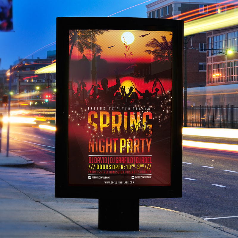 The Spring Night Party is the exclusive Photoshop PSD flyer template designed by ExclusiveFlyer to promote your Spring Night Party. This is a modern, stylish, green flyer and just be used for a Spring Party or maybe Summer Night. Dear customers! – you can also: Customize any flyers or Hire Us to create any unique product. Also, you can get unlimited access to all our templates. You can buy 1 month membership, 3 or 6 months membership or even 1 year membership plan and login on site, choose a design, click the button DOWNLOAD TEMPLATE and it’s yours. No hassle, no checkout! When you paid the template, you can find it in your personal account and of course you’ve got a message to your e-mail (maybe in spam) with link to download. Also, you can find all templates, which you buy, in your personal account! All of our flyers have a very good quality (300DPI). And it means that you just need to download one of them and make the necessary modifications such as replace the elements or choose the colors and start to invite your guests! You can order from us design of Banner Ad, Bi-Fold Brochure, Tri-Fold Brochure, Business Card, Logo, One-Sided Flyer, Two-sided Flyer or Postcard. All you need is to checkout and write us all information on our e-mail or skype. (order now). There are a lot of free flyer templates, free business card templates on our site! Also there are a lot of categories of flyers such as club flyers, seasonal flyers, sport flyers and also business flyers. You have a great choise on our site, so good luck! Don’t forget to follow our Facebook community, our page on Twitter, on Pinterest and on Tumblr and leave comments, cause we work for you! PSD is set up in 1275×1875 dimension (4″×6″ with 0,25″ bleed). The PSD file is very well organised, with color coded groups and layers named appropriately. Remember, all stock images of models and other people used only for demonstration all charms of the flyer and don’t included in the download!