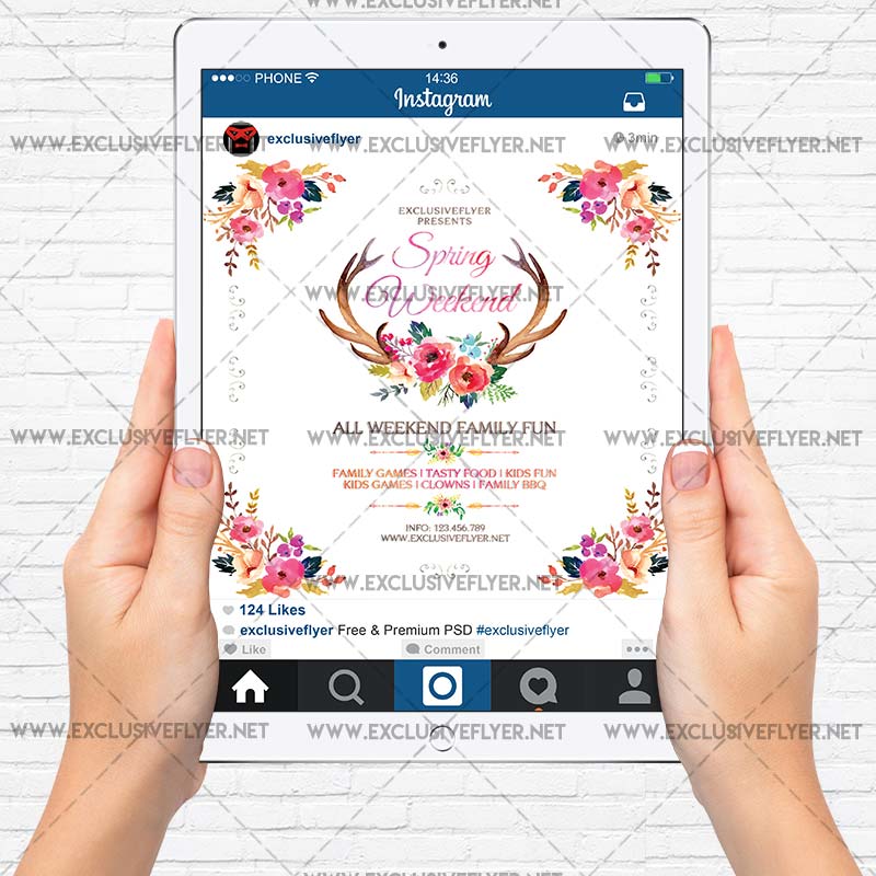 The Spring Weekend is the exclusive Photoshop PSD flyer template designed by ExclusiveFlyer to promote your Spring Weekend. This is a modern, stylish flyer and just be used for a Hello Spring Party, Spring Break Nightm Spring Opening Party, First Spring Party etc. Dear customers! – you can also: Customize any flyers or Hire Us to create any unique product. Also, you can get unlimited access to all our templates. You can buy 1 month membership, 3 or 6 months membership or even 1 year membership plan and login on site, choose a design, click the button DOWNLOAD TEMPLATE and it’s yours. No hassle, no checkout! When you paid the template, you can find it in your personal account and of course you’ve got a message to your e-mail (maybe in spam) with link to download. Also, you can find all templates, which you buy, in your personal account! All of our flyers have a very good quality (300DPI). And it means that you just need to download one of them and make the necessary modifications such as replace the elements or choose the colors and start to invite your guests! You can order from us design of Banner Ad, Bi-Fold Brochure, Tri-Fold Brochure, Business Card, Logo, One-Sided Flyer, Two-sided Flyer or Postcard. All you need is to checkout and write us all information on our e-mail or skype. (order now). There are a lot of free flyer templates, free business card templates on our site! Also there are a lot of categories of flyers such as club flyers, seasonal flyers, sport flyers and also business flyers. You have a great choise on our site, so good luck! Don’t forget to follow our Facebook community, our page on Twitter, on Pinterest and on Tumblr and leave comments, cause we work for you! PSD is set up in 1275×1875 dimension (4” x 6” with 0,25” bleed). The PSD file is very well organised, with color coded groups and layers named appropriately. Remember, all stock images of models and other people used only for demonstration all charms of the flyer and don’t included in the download!