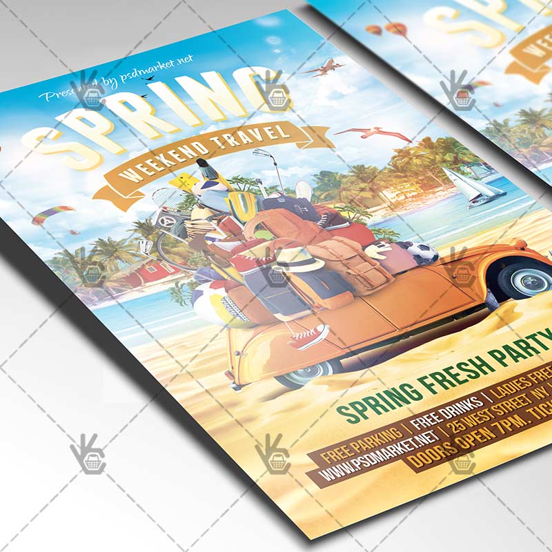 Spring Weekend Travel is a simply modern flyer design by PSDmarket Team to be used with Photoshop CS3 and higher. Save your time and use it for business or for your clients! This can be use for Spring Party, Spring Break, Spring Fest, Spring Night, Spring Travel and others.