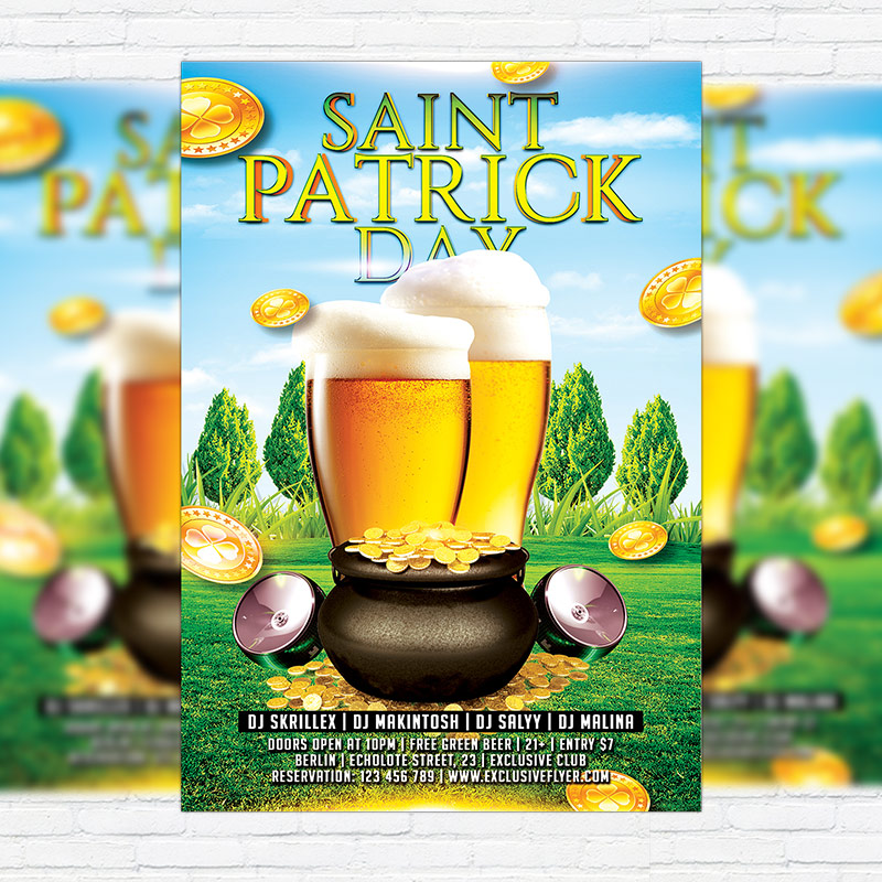 The St. Patricks Day is the exclusive Photoshop PSD flyer template designed by ExclusiveFlyer to promote your St. Patricks Day Party. This is a modern, stylish flyer and just be used for a St. Patricks Day or Lucky Party or Green Party etc. Dear customers! – you can also: Customize any flyers or Hire Us to create any unique product. Also, you can get unlimited access to all our templates. You can buy 1 month membership, 3 or 6 months membership or even 1 year membership plan and login on site, choose a design, click the button DOWNLOAD TEMPLATE and it’s yours. No hassle, no checkout! When you paid the template, you can find it in your personal account and of course you’ve got a message to your e-mail (maybe in spam) with link to download. Also, you can find all templates, which you buy, in your personal account! All of our flyers have a very good quality (300DPI). And it means that you just need to download one of them and make the necessary modifications such as replace the elements or choose the colors and start to invite your guests! You can order from us design of Banner Ad, Bi-Fold Brochure, Tri-Fold Brochure, Business Card, Logo, One-Sided Flyer, Two-sided Flyer or Postcard. All you need is to checkout and write us all information on our e-mail or skype. (order now). There are a lot of free flyer templates, free business card templates on our site! Also there are a lot of categories of flyers such as club flyers, seasonal flyers, sport flyers and also business flyers. You have a great choise on our site, so good luck! Don’t forget to follow our Facebook community, our page on Twitter, on Pinterest and on Tumblr and leave comments, cause we work for you! PSD is set up in 1275×1875 dimension (4” x 6” with 0,25” bleed). The PSD file is very well organised, with color coded groups and layers named appropriately. Remember, all stock images of models and other people used only for demonstration all charms of the flyer and don’t included in the download!