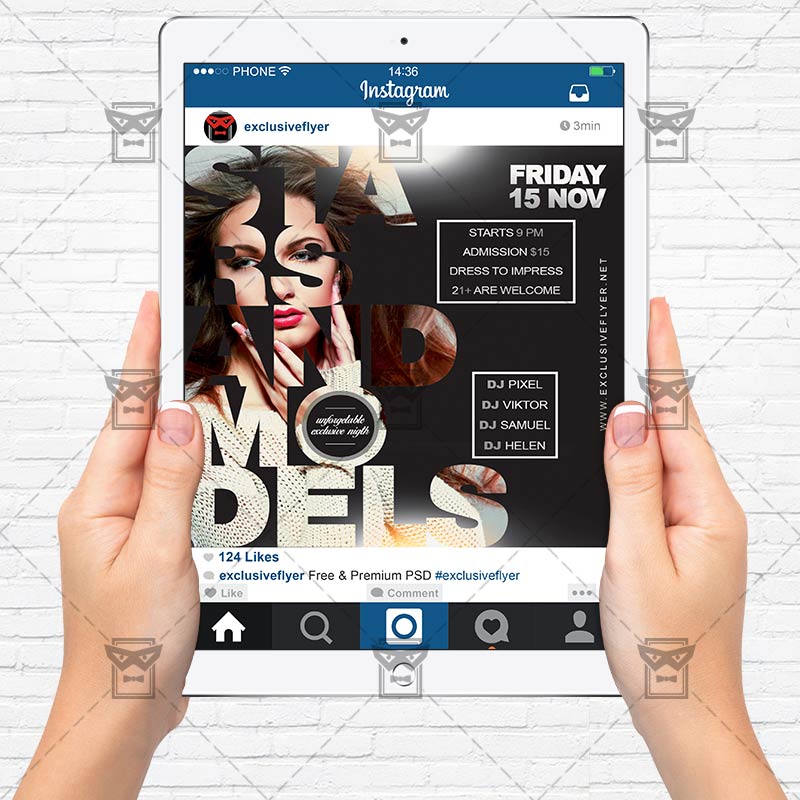 The Stars and Models is the exclusive Photoshop PSD flyer template designed by ExclusiveFlyer to promote your Stars and Models Party. This is a modern, stylish flyer and just be used for a Models and Bottles Party, Gold Stars Party, Fashion Night etc. Dear customers! – you can also: Customize any flyers or Hire Us to create any unique product. Also, you can get unlimited access to all our templates. You can buy 1 month membership, 3 or 6 months membership or even 1 year membership plan and login on site, choose a design, click the button DOWNLOAD TEMPLATE and it’s yours. No hassle, no checkout! When you paid the template, you can find it in your personal account and of course you’ve got a message to your e-mail (maybe in spam) with link to download. Also, you can find all templates, which you buy, in your personal account! All of our flyers have a very good quality (300DPI). And it means that you just need to download one of them and make the necessary modifications such as replace the elements or choose the colors and start to invite your guests! You can order from us design of Banner Ad, Bi-Fold Brochure, Tri-Fold Brochure, Business Card, Logo, One-Sided Flyer, Two-sided Flyer or Postcard. All you need is to checkout and write us all information on our e-mail or skype. (order now). There are a lot of free flyer templates, free business card templates on our site! Also there are a lot of categories of flyers such as club flyers, seasonal flyers, sport flyers and also business flyers. You have a great choise on our site, so good luck! Don’t forget to follow our Facebook community, our page on Twitter, on Pinterest and on Tumblr and leave comments, cause we work for you! PSD is set up in 1275×1875 dimension (4” x 6” with 0,25” bleed). The PSD file is very well organised, with color coded groups and layers named appropriately. Remember, all stock images of models and other people used only for demonstration all charms of the flyer and don’t included in the download!