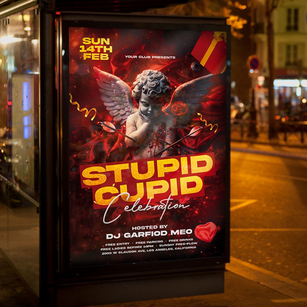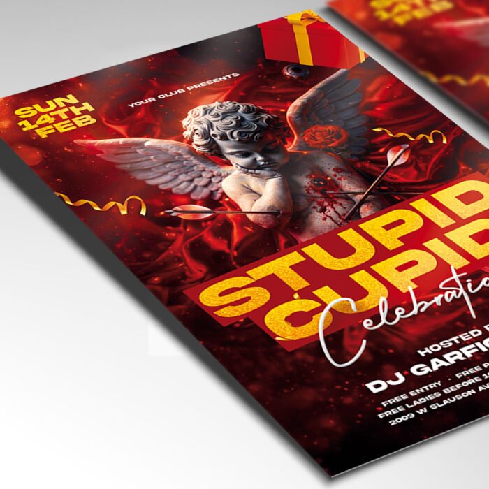 Stupid Cupid 2026 Flyer PSD TemplateForget the clichés and embrace the chaos! Our **Stupid Cupid 2026 Flyer PSD Template** is the ultimate design choice for hosting a February 14th event that caters to the bold, the cynical, and the party-hard crowd. Whether you’re organizing a singles awareness night, an anti-Valentine’s bash, or a high-energy “Stupid Cupid” themed club event for 2026, this template delivers the perfect rebellious vibe. If you want to create an invitation that says “**Cupid is Clueless in 2026**,” “**Ditch the Romance, Keep the Party**,” or “**The Ultimate Anti-Valentine’s Celebration**,” this professional PSD template is your secret weapon. Expect to see high-impact visuals featuring playful or edgy motifs—like mischievous Cupid illustrations, broken hearts, neon graffiti, and bold, irreverent typography that highlights the year 2026. The color palette typically mixes vibrant pinks and reds with gritty black, electric blue, or contrasting yellow, perfectly capturing the fun and defiant spirit of a **Stupid Cupid 2026 Event**. The **Stupid Cupid 2026 Flyer PSD Template** provides a fully flexible and professional layout, ensuring your event stands out with a unique personality. As a meticulously organized Photoshop file, it allows you to customize every detail to match your venue’s specific brand. You can easily update the text for your venue name, the date, time, and entry specials, such as **”Bring a photo of your ex for a free drink”** or **”Singles-only VIP packages.”** Whether you’re planning a tongue-in-cheek mixer or a massive dance party where “no love is allowed,” this template’s modular structure makes editing effortless. Because it is a high-resolution PSD, you can adjust the lighting, swap out background graphics, and fine-tune the color grading to ensure your **Stupid Cupid** promotion looks professional and enticing, attracting exactly the crowd you’re looking for in 2026. Designed for maximum digital and physical reach, the **Stupid Cupid 2026 Flyer PSD Template** is 100% print-ready and optimized for all social media platforms. You can produce eye-catching posters and flyers for street promotion while also exporting perfectly sized versions for Instagram Stories, TikTok, and Facebook. This ensures your event gains massive visibility among those looking for an alternative to the usual romantic dinners. By choosing this playful and edgy flyer template, you aren’t just announcing a party; you’re starting a movement for everyone who wants to have fun without the romantic pressure, making your “**Stupid Cupid 2026**” the most talked-about event of the season. Download this template today and let the 2026 party begin! — Features of the Stupid Cupid 2026 Flyer PSD Template