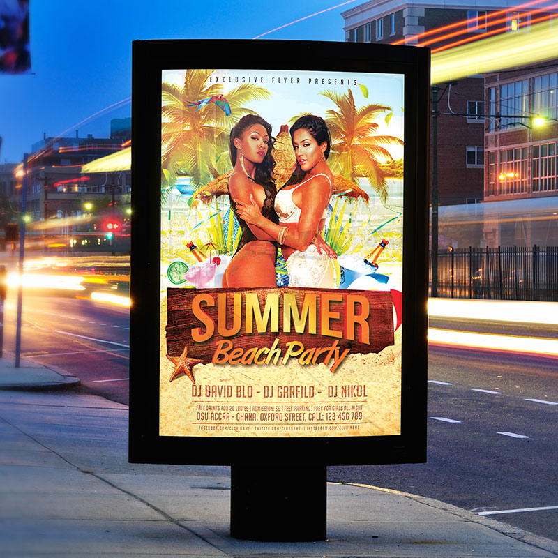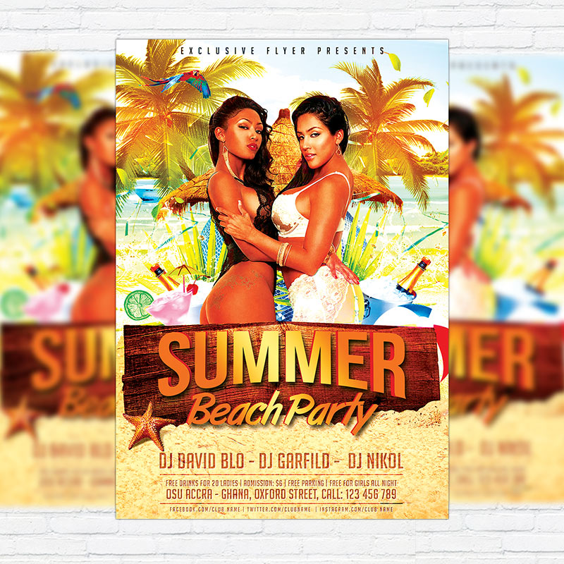 The Summer Beach Party is the exclusive Photoshop PSD flyer template designed by ExclusiveFlyer to promote your Summer Beach Party. This is a modern, stylish, perfect flyer and just be used for a Summer Party or Beach Party or Drink Party etc. Dear customers! – you can also: Customize any flyers or Hire Us to create any unique product. Also, you can get unlimited access to all our templates. You can buy 1 month membership, 3 or 6 months membership or even 1 year membership plan and login on site, choose a design, click the button DOWNLOAD TEMPLATE and it’s yours. No hassle, no checkout! When you paid the template, you can find it in your personal account and of course you’ve got a message to your e-mail (maybe in spam) with link to download. Also, you can find all templates, which you buy, in your personal account! All of our flyers have a very good quality (300DPI). And it means that you just need to download one of them and make the necessary modifications such as replace the elements or choose the colors and start to invite your guests! You can order from us design of Banner Ad, Bi-Fold Brochure, Tri-Fold Brochure, Business Card, Logo, One-Sided Flyer, Two-sided Flyer or Postcard. All you need is to checkout and write us all information on our e-mail or skype. (order now). There are a lot of free flyer templates, free business card templates on our site! Also there are a lot of categories of flyers such as club flyers, seasonal flyers, sport flyers and also business flyers. You have a great choise on our site, so good luck! Don’t forget to follow our Facebook community, our page on Twitter, on Pinterest and on Tumblr and leave comments, cause we work for you! PSD is set up in 1275×1875 dimension (4″×6″ with 0,25″ bleed). The PSD file is very well organised, with color coded groups and layers named appropriately. Remember, all stock images of models and other people used only for demonstration all charms of the flyer and don’t included in the download!