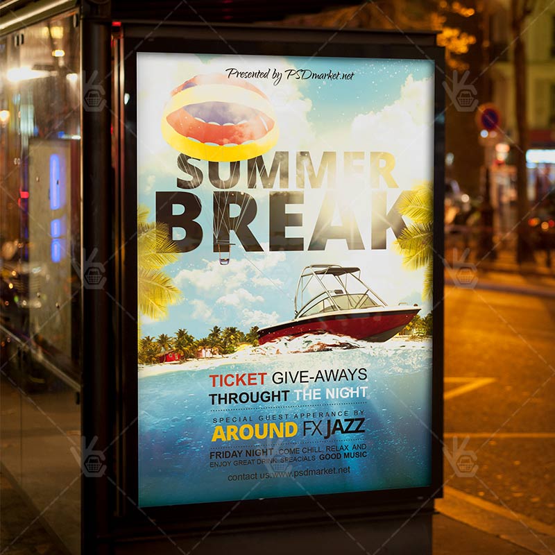 Summer Break Party is a simply modern flyer design by PSDmarket Team to be used with Photoshop CS3 and higher. Save your time and use it for business or for your clients! This can be use for Tropical Summer Party, Beach or Summer Party , BBQ Summer Party, Beach Party, Techno Summer Party or Summer Night and others.