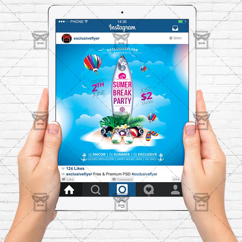 The Summer Break is the exclusive Photoshop PSD flyer template designed by ExclusiveFlyer to promote your Summer Break. This is a modern, stylish flyer and just be used for a Hello Summer Party, Summer Break Night, Summer Opening Party, First Summer Party etc. Dear customers! – you can also: Customize any flyers or Hire Us to create any unique product. Also, you can get unlimited access to all our templates. You can buy 1 month membership, 3 or 6 months membership or even 1 year membership plan and login on site, choose a design, click the button DOWNLOAD TEMPLATE and it’s yours. No hassle, no checkout! When you paid the template, you can find it in your personal account and of course you’ve got a message to your e-mail (maybe in spam) with link to download. Also, you can find all templates, which you buy, in your personal account! All of our flyers have a very good quality (300DPI). And it means that you just need to download one of them and make the necessary modifications such as replace the elements or choose the colors and start to invite your guests! You can order from us design of Banner Ad, Bi-Fold Brochure, Tri-Fold Brochure, Business Card, Logo, One-Sided Flyer, Two-sided Flyer or Postcard. All you need is to checkout and write us all information on our e-mail or skype. (order now). There are a lot of free flyer templates, free business card templates on our site! Also there are a lot of categories of flyers such as club flyers, seasonal flyers, sport flyers and also business flyers. You have a great choise on our site, so good luck! Don’t forget to follow our Facebook community, our page on Twitter, on Pinterest and on Tumblr and leave comments, cause we work for you! PSD is set up in 1275×1875 dimension (4” x 6” with 0,25” bleed). The PSD file is very well organised, with color coded groups and layers named appropriately. Remember, all stock images of models and other people used only for demonstration all charms of the flyer and don’t included in the download!