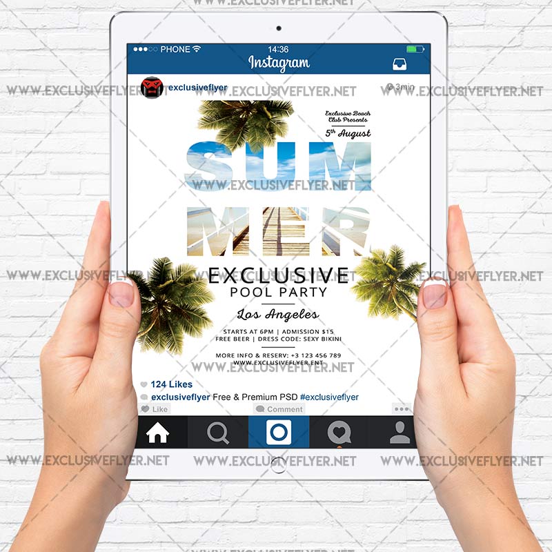 The Summer Exclusive Pool Party is the exclusive Photoshop PSD flyer template designed by ExclusiveFlyer to promote your Summer Exclusive Pool Party. This is a modern, stylish flyer and just be used for a Summer Fest, Summer Jam Night, Sunset Party, Beach Party etc. Dear customers! – you can also: Customize any flyers or Hire Us to create any unique product. Also, you can get unlimited access to all our templates. You can buy 1 month membership, 3 or 6 months membership or even 1 year membership plan and login on site, choose a design, click the button DOWNLOAD TEMPLATE and it’s yours. No hassle, no checkout! When you paid the template, you can find it in your personal account and of course you’ve got a message to your e-mail (maybe in spam) with link to download. Also, you can find all templates, which you buy, in your personal account! All of our flyers have a very good quality (300DPI). And it means that you just need to download one of them and make the necessary modifications such as replace the elements or choose the colors and start to invite your guests! You can order from us design of Banner Ad, Bi-Fold Brochure, Tri-Fold Brochure, Business Card, Logo, One-Sided Flyer, Two-sided Flyer or Postcard. All you need is to checkout and write us all information on our e-mail or skype. (order now). There are a lot of free flyer templates, free business card templates on our site! Also there are a lot of categories of flyers such as club flyers, seasonal flyers, sport flyers and also business flyers. You have a great choise on our site, so good luck! Don’t forget to follow our Facebook community, our page on Twitter, on Pinterest and on Tumblr and leave comments, cause we work for you! PSD is set up in 1819×2551 dimension. The PSD file is very well organised, with color coded groups and layers named appropriately. Remember, all stock images of models and other people used only for demonstration all charms of the flyer and don’t included in the download!