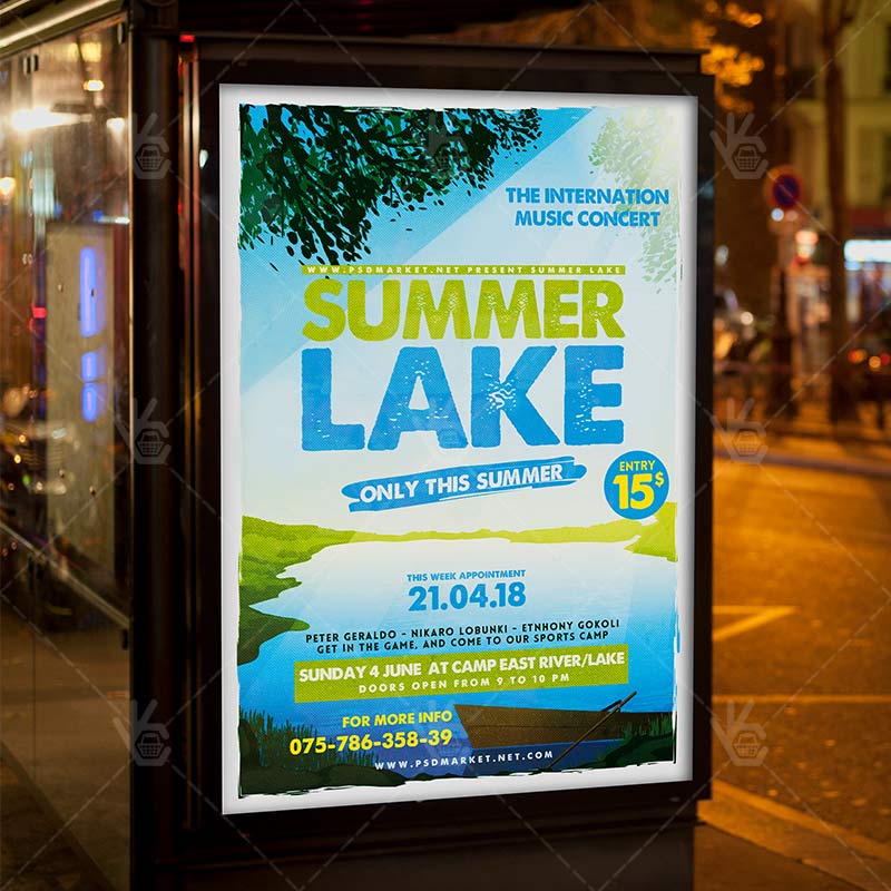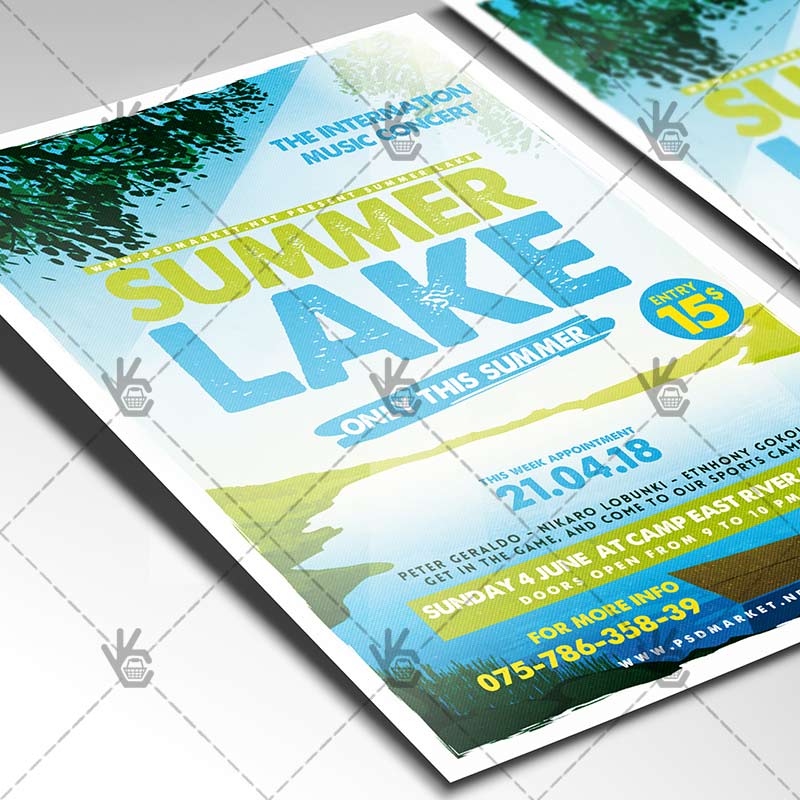 Summer Lake is a simply modern flyer design by PSDmarket Team to be used with Photoshop CS3 and higher. Save your time and use it for business or for your clients! This can be use for Summer Camp, Beach or Summer Party , BBQ Summer Party, Beach Party, Spring Camp or Summer Night and others.