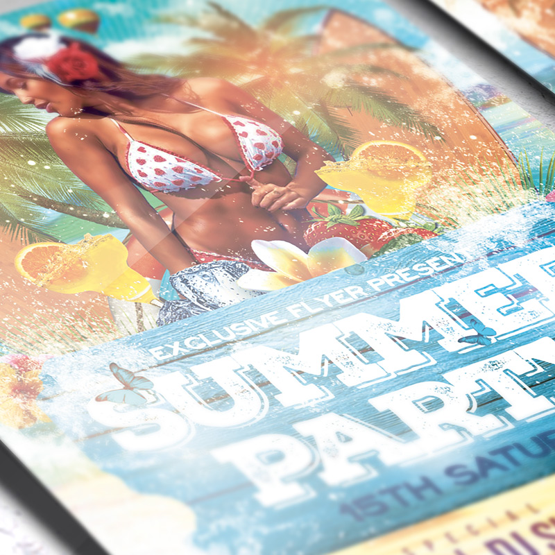 The Summer Party is the exclusive Photoshop PSD flyer template designed by ExclusiveFlyer to promote your Summer Party. This is a modern, stylish, fresh flyer and just be used for a Pool Party or Summer Night or Summer Session etc. Dear customers! – you can also: Customize any flyers or Hire Us to create any unique product. Also, you can get unlimited access to all our templates. You can buy 1 month membership, 3 or 6 months membership or even 1 year membership plan and login on site, choose a design, click the button DOWNLOAD TEMPLATE and it’s yours. No hassle, no checkout! When you paid the template, you can find it in your personal account and of course you’ve got a message to your e-mail (maybe in spam) with link to download. Also, you can find all templates, which you buy, in your personal account! All of our flyers have a very good quality (300DPI). And it means that you just need to download one of them and make the necessary modifications such as replace the elements or choose the colors and start to invite your guests! You can order from us design of Banner Ad, Bi-Fold Brochure, Tri-Fold Brochure, Business Card, Logo, One-Sided Flyer, Two-sided Flyer or Postcard. All you need is to checkout and write us all information on our e-mail or skype. (order now). There are a lot of free flyer templates, free business card templates on our site! Also there are a lot of categories of flyers such as club flyers, seasonal flyers, sport flyers and also business flyers. You have a great choise on our site, so good luck! Don’t forget to follow our Facebook community, our page on Twitter, on Pinterest and on Tumblr and leave comments, cause we work for you! PSD is set up in 1275×1875 dimension (4″×6″ with 0,25″ bleed). The PSD file is very well organised, with color coded groups and layers named appropriately. Remember, all stock images of models and other people used only for demonstration all charms of the flyer and don’t included in the download!