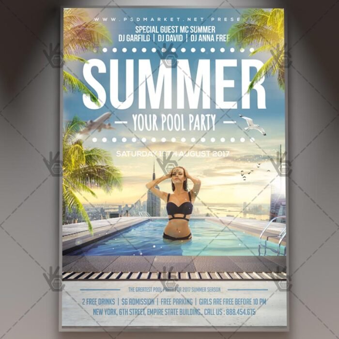 Summer Pool Party is a simply modern flyer design by PSDmarket Team to be used with Photoshop CS3 and higher. Save your time and use it for business or for your clients! This can be use for Tropical Summer Party, Beach or Summer Party , BBQ Summer Party, Beach Party, Techno Summer Party or Summer Night and others.