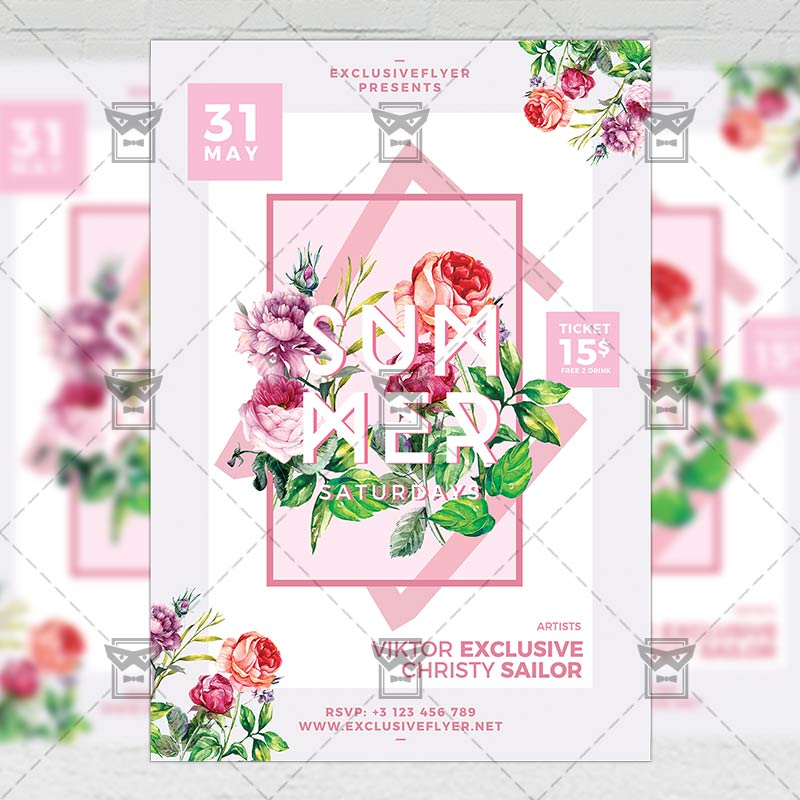 Summer Saturdays is an exclusive PSD flyer template for Adobe Photoshop designed by our best graphic designers to facilitate your task in promoting your business. With our readymade Summer flyer in psd format you can invite you customers and guest to your event or to the best Summer Night, Summer Party, Sunset Night or Palms Beach Night in their lives.