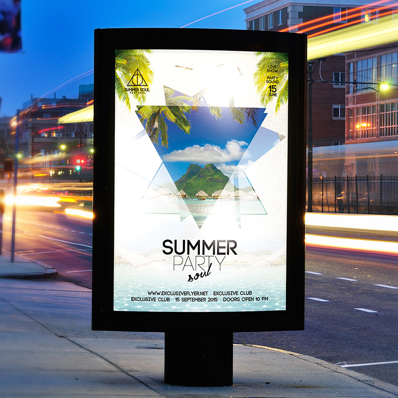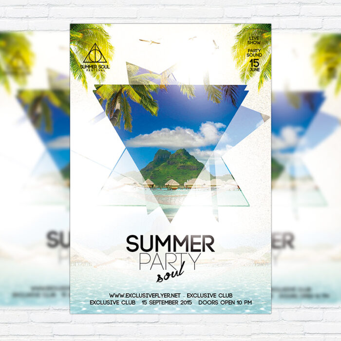 The Summer Soul Party is the exclusive Photoshop PSD flyer template designed by ExclusiveFlyer to promote your Summer Soul Party. This is a modern, stylish, summer flyer and just be used for a Electro Party or Summer Night or Summer Session etc. Dear customers! – you can also: Customize any flyers or Hire Us to create any unique product. Also, you can get unlimited access to all our templates. You can buy 1 month membership, 3 or 6 months membership or even 1 year membership plan and login on site, choose a design, click the button DOWNLOAD TEMPLATE and it’s yours. No hassle, no checkout! When you paid the template, you can find it in your personal account and of course you’ve got a message to your e-mail (maybe in spam) with link to download. Also, you can find all templates, which you buy, in your personal account! All of our flyers have a very good quality (300DPI). And it means that you just need to download one of them and make the necessary modifications such as replace the elements or choose the colors and start to invite your guests! You can order from us design of Banner Ad, Bi-Fold Brochure, Tri-Fold Brochure, Business Card, Logo, One-Sided Flyer, Two-sided Flyer or Postcard. All you need is to checkout and write us all information on our e-mail or skype. (order now). There are a lot of free flyer templates, free business card templates on our site! Also there are a lot of categories of flyers such as club flyers, seasonal flyers, sport flyers and also business flyers. You have a great choise on our site, so good luck! Don’t forget to follow our Facebook community, our page on Twitter, on Pinterest and on Tumblr and leave comments, cause we work for you! PSD is set up in 1275×1875 dimension (4″×6″ with 0,25″ bleed). The PSD file is very well organised, with color coded groups and layers named appropriately. Remember, all stock images of models and other people used only for demonstration all charms of the flyer and don’t included in the download!