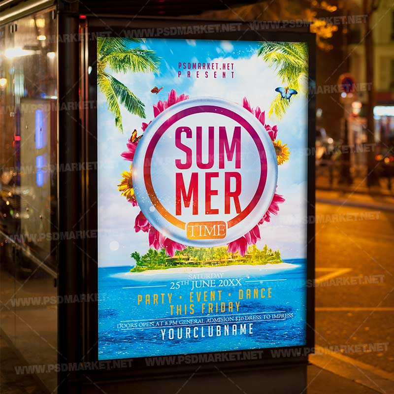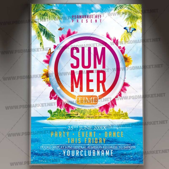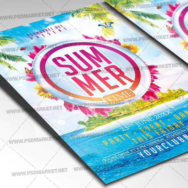 Summer Time Template Flyer PSD is a simply modern flyer design by PSDmarket Team to be used with Photoshop CS3 and higher. Save your time and use it for business or for your clients! This can be use for Summer Time, Summer Party, Summer Vibes, Summer Madness Party, Summer Night, Summer Time Party, Club Summer Party, Summer Dj Night, Summer Ibiza Party and others.