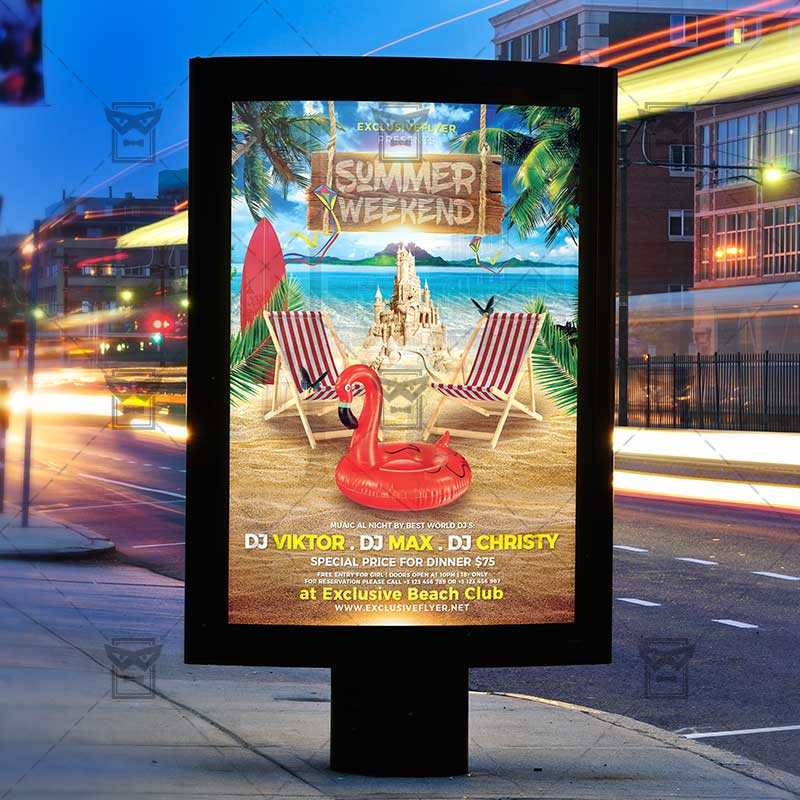 Summer Weekend is an exclusive PSD flyer template for Adobe Photoshop designed by our best graphic designers to facilitate your task in promoting your business. With our readymade Summer flyer in psd format you can invite you customers and guest to your event or to the best Summer Night, Beach Party, Sunset Party or Summer Vacation Party in their lives.