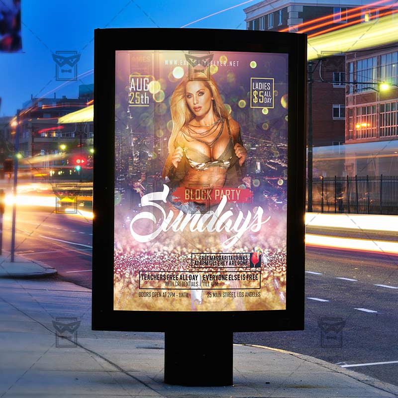 Sundays Block Party is an exclusive PSD flyer template for Adobe Photoshop designed by our best graphic designers to facilitate your task in promoting your business. With our readymade Club flyer in psd format you can invite you customers and guest to your event or to the best Sunday Night, Block Party, Club Party or Music Night Out in their lives.
