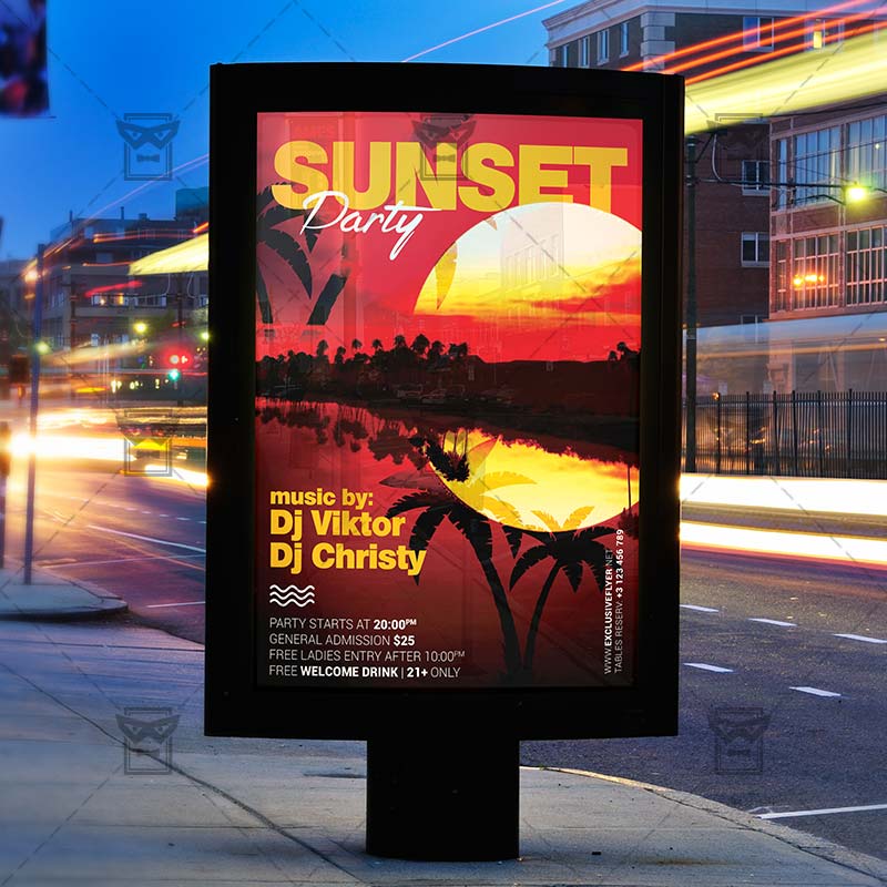 Sunset Party is an exclusive PSD flyer template for Adobe Photoshop designed by our best graphic designers to facilitate your task in promoting your business. With our readymade Summer flyer in psd format you can invite you customers and guest to your event or to the best Sunset Night, Summer Night Party, Hawaii Night or Beach Party in their lives.