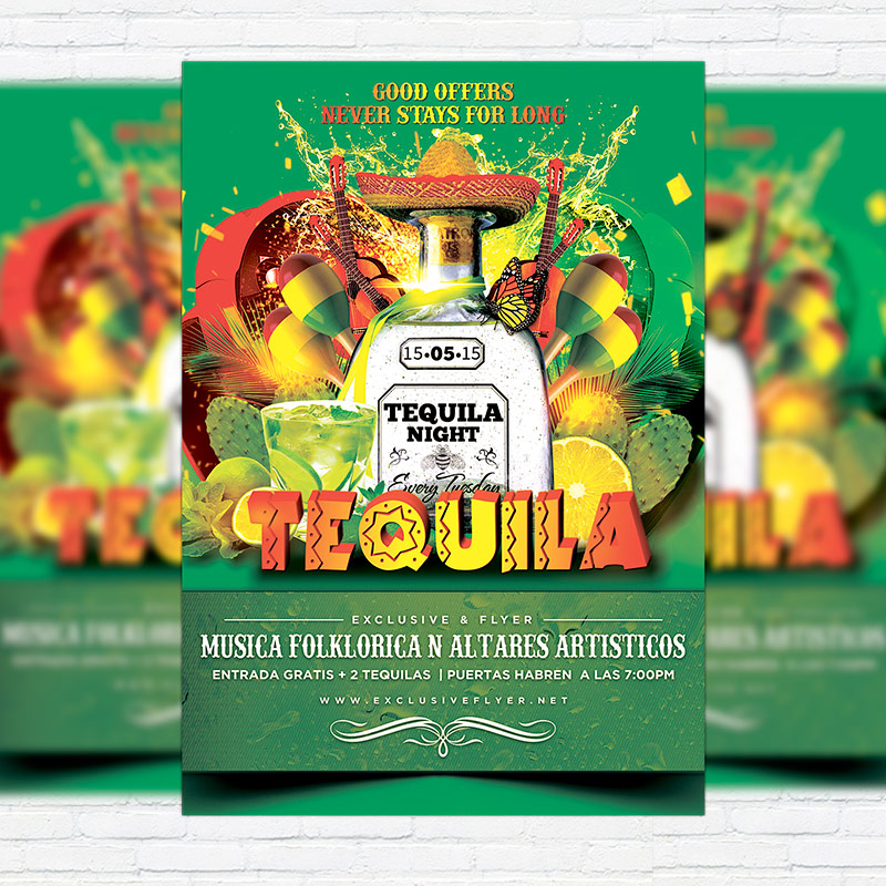 The Tequila Party is the exclusive Photoshop PSD flyer/poster template designed by ExclusiveFlyer to promote your Tequila Party. This is a modern, stylish, green flyer and just be used for a Mexican Party, Green Party, Latino Party or Mojito Night. Dear customers! – you can also: Customize any flyers or Hire Us to create any unique product. Also, you can get unlimited access to all our templates. You can buy 1 month membership, 3 or 6 months membership or even 1 year membership plan and login on site, choose a design, click the button DOWNLOAD TEMPLATE and it’s yours. No hassle, no checkout! When you paid the template, you can find it in your personal account and of course you’ve got a message to your e-mail (maybe in spam) with link to download. Also, you can find all templates, which you buy, in your personal account! All of our flyers have a very good quality (300DPI). And it means that you just need to download one of them and make the necessary modifications such as replace the elements or choose the colors and start to invite your guests! You can order from us design of Banner Ad, Bi-Fold Brochure, Tri-Fold Brochure, Business Card, Logo, One-Sided Flyer, Two-sided Flyer or Postcard. All you need is to checkout and write us all information on our e-mail or skype. (order now). There are a lot of free flyer templates, free business card templates on our site! Also there are a lot of categories of flyers such as club flyers, seasonal flyers, sport flyers and also business flyers. You have a great choise on our site, so good luck! Don’t forget to follow our Facebook community, our page on Twitter, on Pinterest and on Tumblr and leave comments, cause we work for you! PSD is set up in 1275×1875 dimension (4″×6″ with 0,25″ bleed). The PSD file is very well organised, with color coded groups and layers named appropriately. Remember, all stock images of models and other people used only for demonstration all charms of the flyer and don’t included in the download!