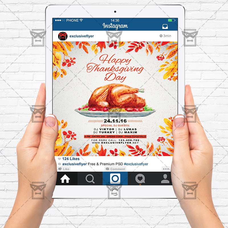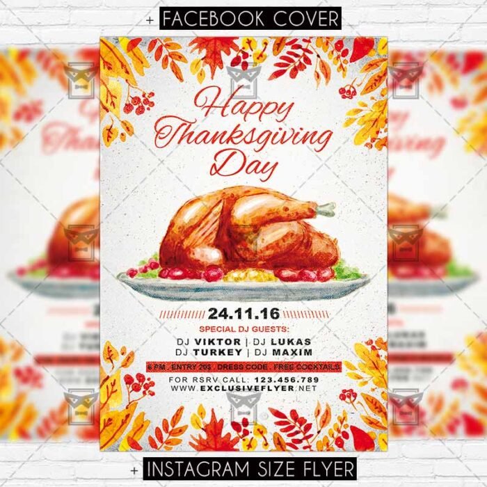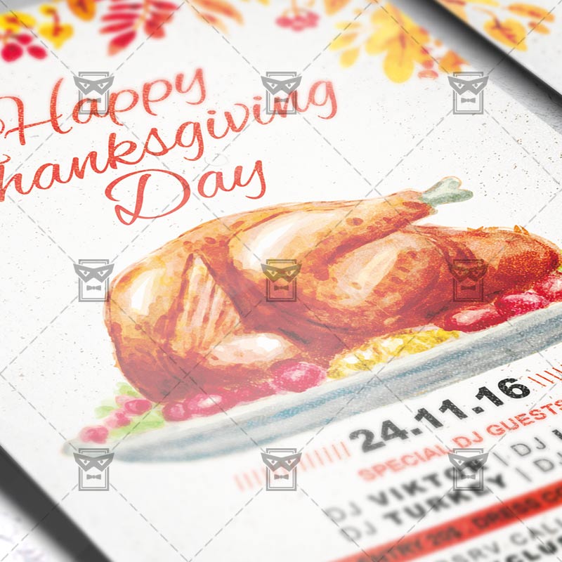 The Thanksgiving Day is the exclusive Photoshop PSD flyer template designed by ExclusiveFlyer to promote your Thanksgiving Day Party. This is a modern, stylish flyer and just be used for a Thanksgiving Night, Thanksgiving Party, Turkey Fest etc. Dear customers! – you can also: Customize any flyers or Hire Us to create any unique product. Also, you can get unlimited access to all our templates. You can buy 1 month membership, 3 or 6 months membership or even 1 year membership plan and login on site, choose a design, click the button DOWNLOAD TEMPLATE and it’s yours. No hassle, no checkout! When you paid the template, you can find it in your personal account and of course you’ve got a message to your e-mail (maybe in spam) with link to download. Also, you can find all templates, which you buy, in your personal account! All of our flyers have a very good quality (300DPI). And it means that you just need to download one of them and make the necessary modifications such as replace the elements or choose the colors and start to invite your guests! You can order from us design of Banner Ad, Bi-Fold Brochure, Tri-Fold Brochure, Business Card, Logo, One-Sided Flyer, Two-sided Flyer or Postcard. All you need is to checkout and write us all information on our e-mail or skype. (order now). There are a lot of free flyer templates, free business card templates on our site! Also there are a lot of categories of flyers such as club flyers, seasonal flyers, sport flyers and also business flyers. You have a great choise on our site, so good luck! Don’t forget to follow our Facebook community, our page on Twitter, on Pinterest and on Tumblr and leave comments, cause we work for you! PSD is set up in 1275×1875 dimension (4” x 6” with 0,25” bleed). The PSD file is very well organised, with color coded groups and layers named appropriately. Remember, all stock images of models and other people used only for demonstration all charms of the flyer and don’t included in the download!