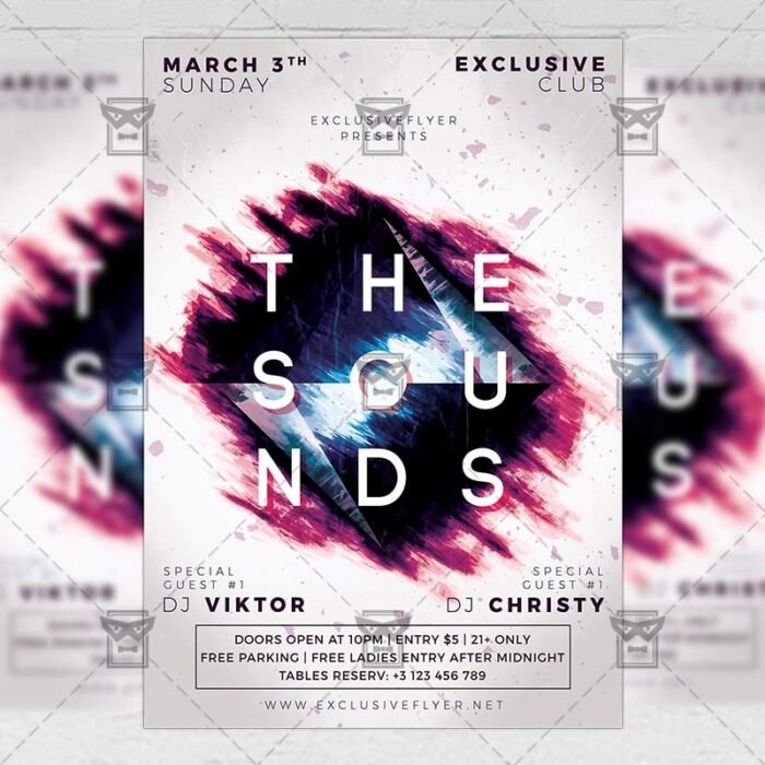 The Sounds is an exclusive PSD flyer template for Adobe Photoshop designed by our best graphic designers to facilitate your task in promoting your business. With our readymade The Sounds Party flyer in psd format you can invite you customers and guest to your event or to the best Lounge Party Night, Chill Out Fridays, Club Night or Chill Party in their lives.