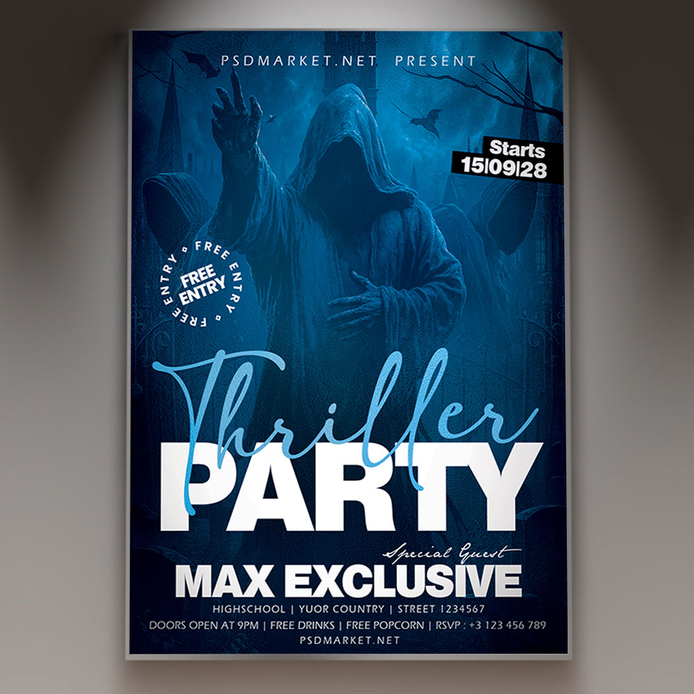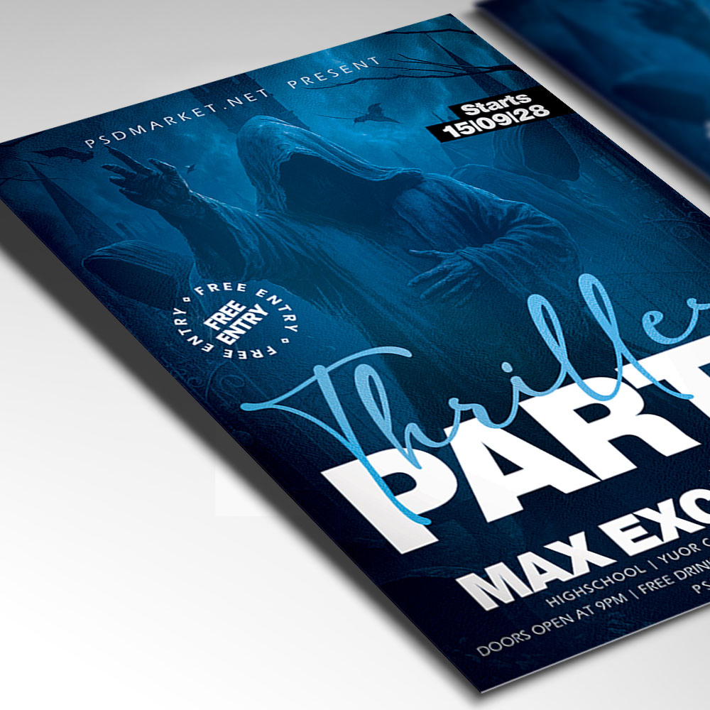 Thriller Party Night Flyer TemplateStep into the shadows and prepare for a night of captivating suspense with our adrenaline-pumping **Thriller Party Night Flyer Template**! This intense and dramatic design is the perfect tool for promoting a high-energy, mystery-themed club event, a spooky costume dance party, a murder mystery evening, or any occasion where you want to combine the excitement of a party with the captivating flair of a thriller. If you’re looking to create an irresistible invitation that screams “**dare to be thrilled**,” “**the mystery begins at dark**,” and “**dance floor survival**,” this flyer template is engineered to draw a massive and eager crowd of fun-seekers and suspense lovers. Expect to see striking visuals, often incorporating energetic elements like dramatic spotlights, foggy backdrops, classic horror or mystery silhouettes, and a bold, unsettling typography that perfectly captures the raw, intense, and exhilarating spirit of a **Thriller Party Night**. This template is all about setting a captivating, high-energy mood, making your event the ultimate destination for an unforgettable experience. The **Thriller Party Night Flyer Template** offers a highly adaptable and professional layout, ensuring you can clearly communicate all the essential details of your event while perfectly maintaining its thrilling and inviting atmosphere. You can easily customize the text fields to include the specific date and time of your event, the electrifying venue location, any special entry requirements (e.g., ticket purchase details, mandatory costumes), and information about featured entertainment (e.g., a **DJ** spinning dramatic hits, a live performance), details on the **dance contest** or mystery game, or enticing food and drink specials (e.g., “killer cocktails,” “suspense snacks”), all presented in a clear and appealing way. Add an enticing description of what attendees can expect, perhaps highlighting opportunities for a special **VIP viewing area**, a themed photo booth, or simply enjoying the high-energy, suspenseful atmosphere. And of course, include clear contact information or prominent social media handles for further engagement and ticket sales. Many templates also provide exciting options to incorporate additional dynamic graphics like lightning effects, abstract geometric shapes, or aggressive visual overlays, or to adjust the impactful color palette (often deep reds, sharp blacks, and dark blues) to perfectly match your brand’s aesthetic or the event’s specific vibe. This lets you create a truly unique and memorable promotional piece that looks as intense and exciting as your party feels. Engineered for maximum reach, the **Thriller Party Night Flyer Template** is designed to be both print-ready for stunning physical distribution and seamlessly optimized for digital sharing. This ensures your exciting invitation reaches a wide and enthusiastic audience. Create eye-catching physical flyers to distribute at clubs, theaters, dance venues, or through themed event groups. Effortlessly share the flyer digitally through various social media channels with engaging captions that highlight the night’s energetic vibe and suspense, email announcements that build anticipation, and online event listings that attract music lovers, dancers, and anyone looking for a thrilling night. This dual functionality helps to maximize visibility and create significant buzz around your Thriller Party Night. By utilizing this distinctive and attention-grabbing flyer template, you’re not just announcing a party; you’re creating an invitation that broadcasts pure, thrilling fun and promises an experience filled with great music, intense energy, and unforgettable memories, making your “**Thriller Party Night**” the ultimate destination for an epic gathering. Grab this template today and prepare for a night of mystery and dance! — Features of the Thriller Party Night Flyer Template