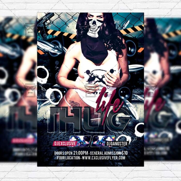 The Thug Life is the exclusive Photoshop PSD flyer template designed by ExclusiveFlyer to promote your Thug Life Party. This is a modern, stylish flyer and just be used for a Gangsta Party or Gangsters Night etc. Dear customers! – you can also: Customize any flyers or Hire Us to create any unique product. Also, you can get unlimited access to all our templates. You can buy 1 month membership, 3 or 6 months membership or even 1 year membership plan and login on site, choose a design, click the button DOWNLOAD TEMPLATE and it’s yours. No hassle, no checkout! When you paid the template, you can find it in your personal account and of course you’ve got a message to your e-mail (maybe in spam) with link to download. Also, you can find all templates, which you buy, in your personal account! All of our flyers have a very good quality (300DPI). And it means that you just need to download one of them and make the necessary modifications such as replace the elements or choose the colors and start to invite your guests! You can order from us design of Banner Ad, Bi-Fold Brochure, Tri-Fold Brochure, Business Card, Logo, One-Sided Flyer, Two-sided Flyer or Postcard. All you need is to checkout and write us all information on our e-mail or skype. (order now). There are a lot of free flyer templates, free business card templates on our site! Also there are a lot of categories of flyers such as club flyers, seasonal flyers, sport flyers and also business flyers. You have a great choise on our site, so good luck! Don’t forget to follow our Facebook community, our page on Twitter, on Pinterest and on Tumblr and leave comments, cause we work for you! PSD is set up in 1275×1875 dimension (4” x 6” with 0,25” bleed). The PSD file is very well organised, with color coded groups and layers named appropriately. Remember, all stock images of models and other people used only for demonstration all charms of the flyer and don’t included in the download!