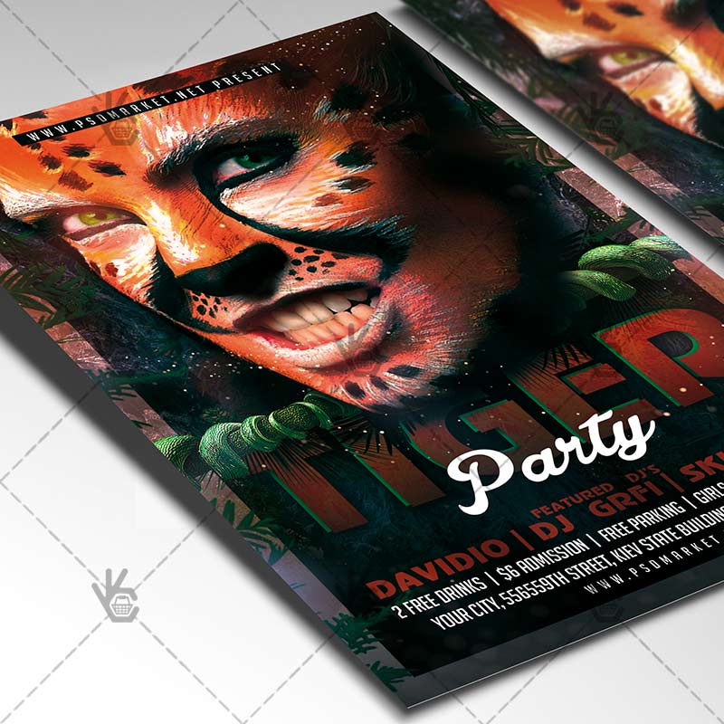 Tiger Party Flyer is a simply modern flyer design by PSDmarket Team to be used with Photoshop CS3 and higher. Save your time and use it for business or for your clients! This can be use for Tiger Party, Tiger Party Night, Tiger Party Event, Wild Party, Wild Night, Animal Party, Animal Night, Animal Fiesta, Safari Party, Safari Night and others.