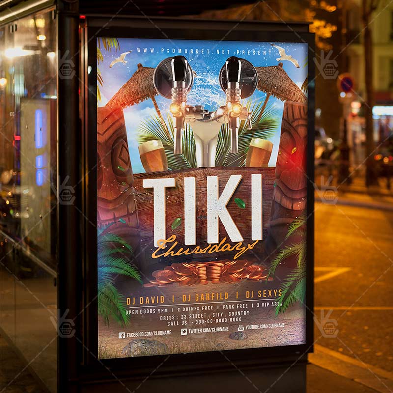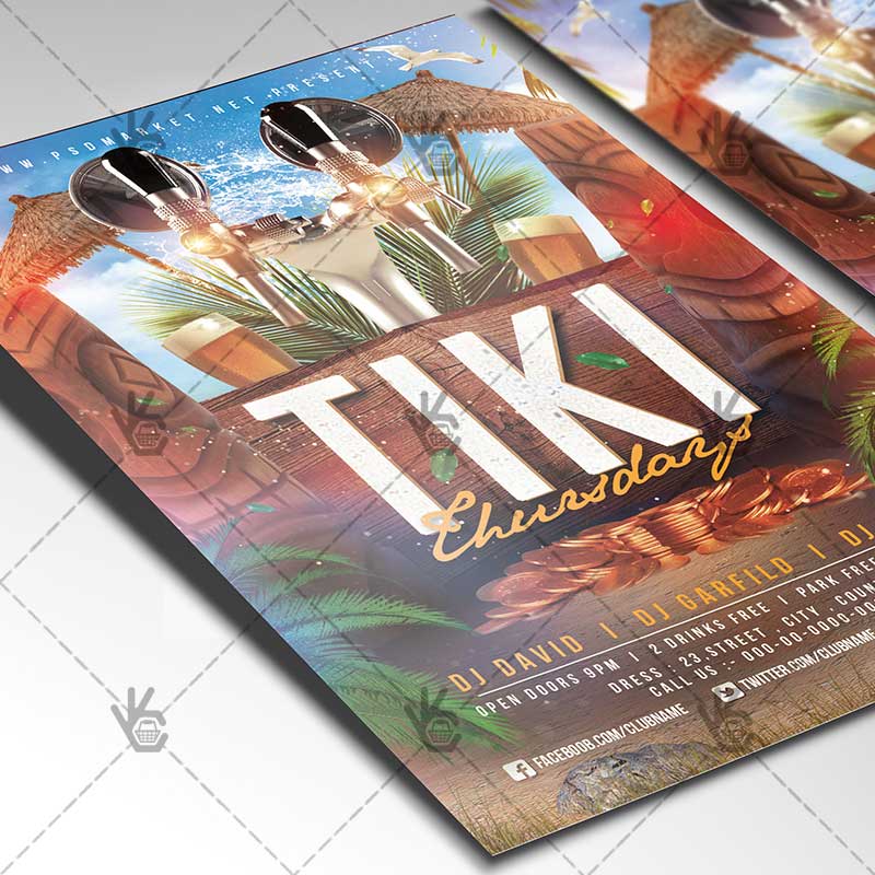 Tiki Thursdays Flyer is a simply modern flyer design by PSDmarket Team to be used with Photoshop CS3 and higher. Save your time and use it for business or for your clients! This can be use for Tiki Thursdays, Tiki Party, Tiki Night, Tropical Summer Party, Tiki Bar Night, Aloha Party, Beach Party, Tiki Bar Party, Luau Party or Summer Night and others.
