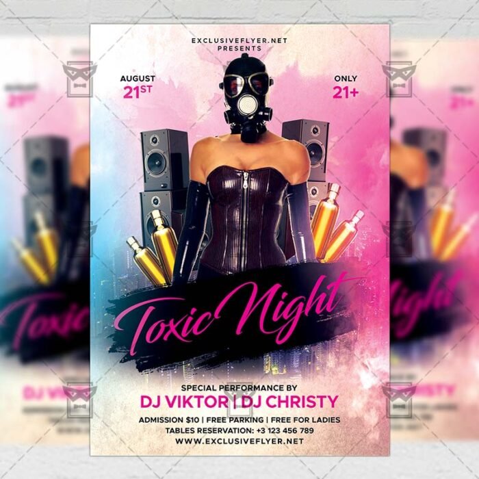 Toxic Night an exclusive PSD flyer template for Adobe Photoshop designed by our best graphic designers to facilitate your task in promoting your business. With our readymade Club flyer in psd format you can invite you customers and guest to your event or to the best Toxic Party, Toxic Bash, Club Party or Party Night in their lives.