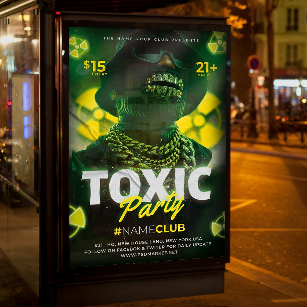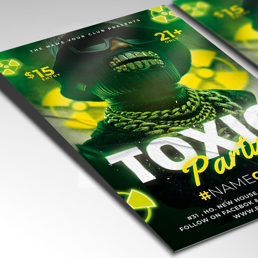Toxic Party Flyer PSD TemplateInfuse your event with a dangerously high level of energy! Our Toxic Party Flyer PSD Template is the ultimate visual catalyst for nightclubs, underground raves, and themed event organizers looking to break the mold in 2026. The “Toxic” theme is all about high-contrast visuals, edgy industrial aesthetics, and a “caution: high fun” atmosphere. If you are planning an event that promises “Electric Intensity,” “The Ultimate Glow Experience,” or “Warning: The Wildest Night of the Year,” this professional PSD template is your perfect marketing tool. Featuring 3D biohazard symbols, neon green chemical glows, industrial textures, and aggressive, modern typography, this design ensures your Toxic Party captures immediate attention. The signature color palette—vibrant neon lime, radioactive yellow, and deep obsidian black—creates an unmistakable visual punch that screams excitement. The Toxic Party Flyer PSD Template is engineered for professional-grade customization with effortless ease. As a fully layered Photoshop file, it allows you to dominate the creative process. You can quickly edit text layers to feature your headlining DJs, venue address, date, and exclusive ticket information. Use the smart object layers to highlight unique event activations such as neon paint zones, glowing liquid nitrogen cocktails, industrial techno sets, or UV-reactive decor. Whether you are promoting a massive warehouse festival or a boutique themed club night, the high-resolution structure ensures that every glow effect, smoke texture, and shadow remains crisp and high-impact. This Toxic Party template is designed to look as elite on a high-gloss printed poster as it does on a high-definition mobile screen. Optimized for a dominant 2026 cross-platform marketing strategy, this template is 100% print-ready and perfectly scaled for social media virality. You can produce stunning, high-contrast physical flyers that pop under club lighting while simultaneously creating high-engagement posts for Instagram, TikTok, and Facebook. This ensures your event reaches the trend-seeking audience of 2026, driving ticket sales and building massive anticipation. By choosing this bold and professional flyer template, you are promising your guests a transformative and high-octane experience. Make your “Toxic Party” the most legendary themed event of the season. Download this premium template today and start the countdown to a radioactive celebration! — Features of the Toxic Party Flyer PSD Template
