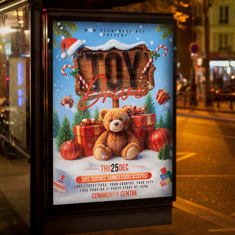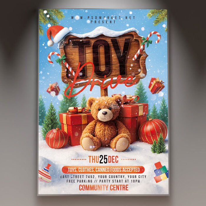 Toy Drive Party 2027 Flyer PSD TemplateCombine the joy of giving with a fantastic celebration! Our vibrant and engaging **Toy Drive Party 2027 Flyer PSD Template** is the essential design tool for promoting a social event, party, or fundraiser where the entry fee or focus is the donation of a new, unwrapped toy for charity, specifically highlighting the year 2027. This template is perfect for nightclubs, community centers, organizations, or private groups hosting a charitable event that blends music, fun, and philanthropy. This professional PSD template offers full customizability to ensure your event looks as exciting, altruistic, and memorable as a party with a purpose. If you’re looking to create an irresistible invitation that screams “**Party for a Purpose in 2027!**,” “**Donate a Toy, Dance All Night!**,” and “**The Charitable Bash of the New Year**,” this flyer template is engineered to draw a huge, generous crowd ready to celebrate and contribute. Expect to see striking visuals, often incorporating dynamic party elements like lighting effects, crowd graphics, DJ equipment (or a dance floor), alongside heartwarming charitable symbols like wrapped gifts, festive decorations, bold, inviting typography prominently featuring ‘2027’, and a high-energy color scheme (a blend of holiday red/green with vibrant party colors like neon blue/pink or electric gold) that perfectly captures the thrilling and philanthropic spirit of a **Toy Drive Party 2027 Event**. This template is all about setting a dual mood of high-energy celebration and meaningful community service. The **Toy Drive Party 2027 Flyer PSD Template** offers a highly adaptable and professional layout (as a PSD file), ensuring you can clearly communicate all the essential details of your event while perfectly maintaining its exciting atmosphere. You can easily customize the text fields to include the specific date and time of the party, the venue location, the required donation for entry (e.g., one new toy per person), information about featured entertainment (e.g., **live DJ set**, drink specials, special guest appearances), details on **exclusive VIP packages** related to larger donations, or information about the specific charity that will benefit from the collected toys. Add an enticing description of what attendees can expect, perhaps highlighting opportunities for **dancing**, socializing, and simply enjoying the feel-good atmosphere of giving back. And of course, include clear contact information or prominent social media handles for further engagement and RSVPs. Being a PSD template, it offers exciting options to incorporate additional dynamic graphics like light flares, subtle smoke effects, or elegant textures, or to adjust the impactful color palette to perfectly match your brand’s aesthetic or the event’s specific vibe. This lets you create a truly unique and memorable promotional piece that looks as lively and rewarding as your Toy Drive Party 2027 feels. Engineered for maximum reach, the **Toy Drive Party 2027 Flyer PSD Template** is designed to be both print-ready for stunning physical distribution and seamlessly optimized for digital sharing. This ensures your exciting invitation reaches a wide and enthusiastic audience. Create eye-catching physical flyers to distribute at high-traffic areas, and effortlessly share the flyer digitally through various social media channels with engaging captions that highlight the fun and the cause, email announcements that build anticipation, and online event listings that attract attendees. This dual functionality helps to maximize visibility and create significant buzz around your Toy Drive Party 2027 Event. By utilizing this distinctive and attention-grabbing flyer template, you’re not just announcing a fundraiser; you’re creating an invitation that broadcasts pure, energetic celebration combined with a noble cause, making your “**Toy Drive Party 2027**” the essential charitable and social destination. Grab this template today and start spreading the goodwill! — Features of the Toy Drive Party 2027 Flyer PSD Template